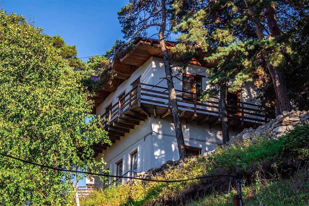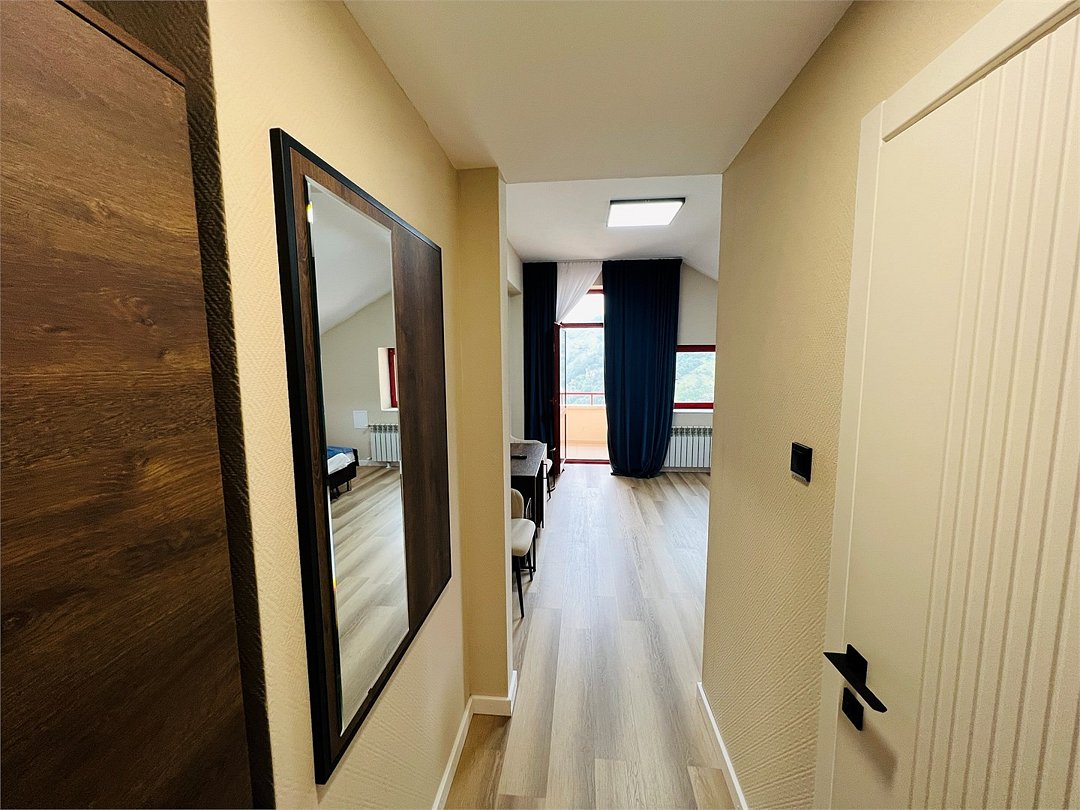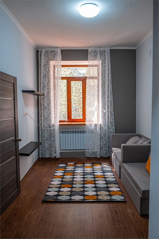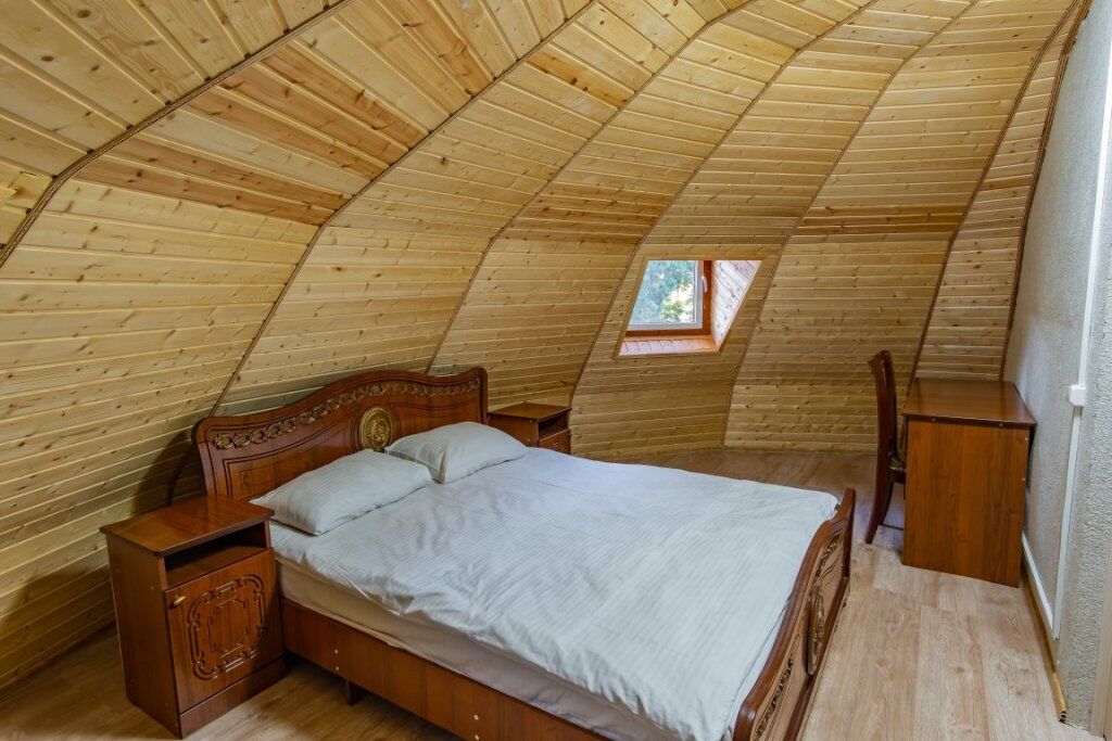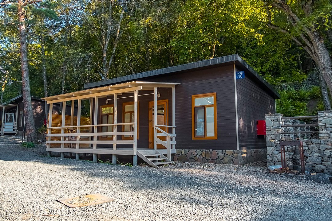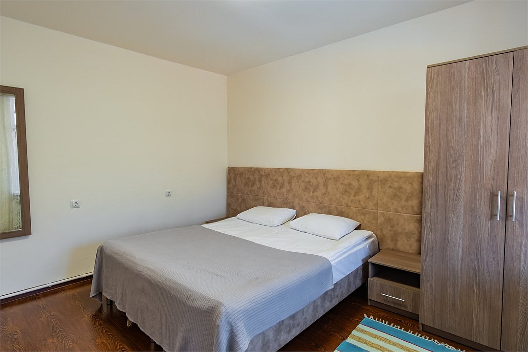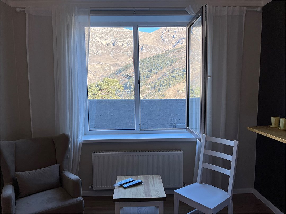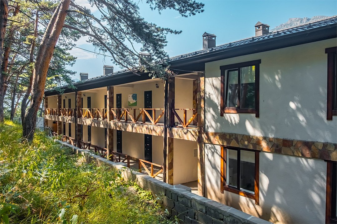 Апартаменты однокомнатные (до 2 человек) с видом на горы: Спальня — двуспальная кровать, шкаф, трюмо+зеркало, две тумбы, плотные шторы. Кухня: оборудованная стенка, холодильник, газовая печь, стол+стулья, телевизор, набор посуды. Ванная комната: умывальник, санузел, ванна, средства гигиены. Рядом с апартаментами оборудована общая мангальная зона. У каждого номера отдельная беседка.Услуги и удобства
