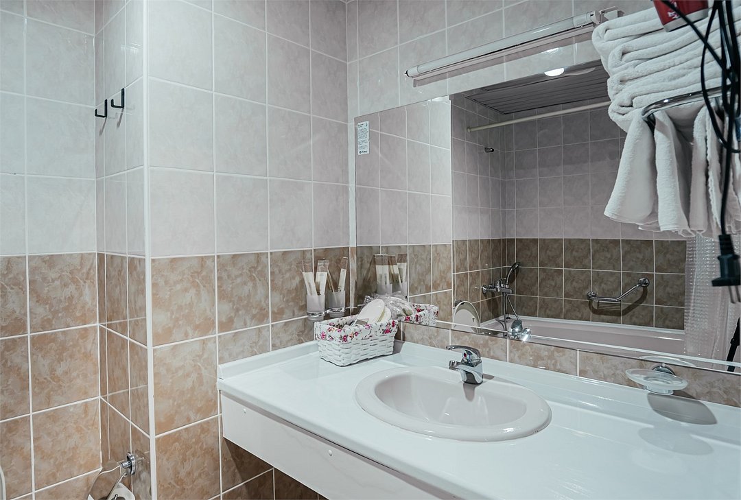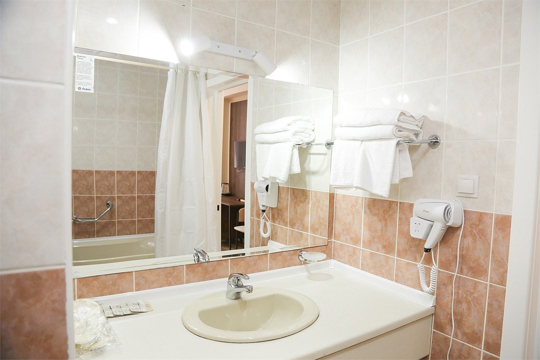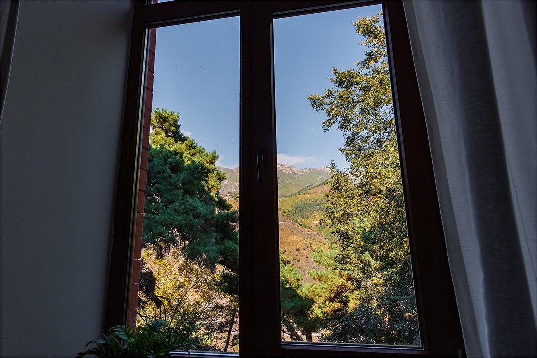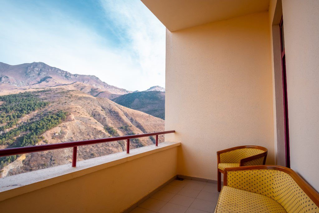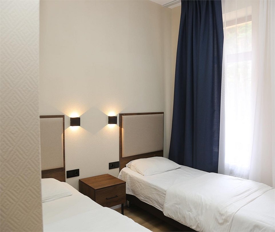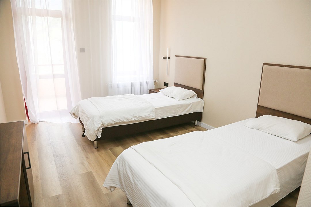 Просторный номер с балконом и видом на Кавказские горы. Имеется возможность полного затемнения. Две односпальных кровати, письменный стол, стул две прикроватные тумбы. В номере есть телевизор, чайник, кружки и стаканы. В ванной комнате есть: ванна, умывальник, фен, косметика для душа, тапочки и ванна. В каждом номере из-под крана течет чистая горная вода из лечебного источника. Информационная папка в номере расскажет вам о всех имеющихся возможностях курорта и экскурсиях.Услуги и удобства