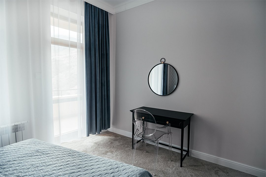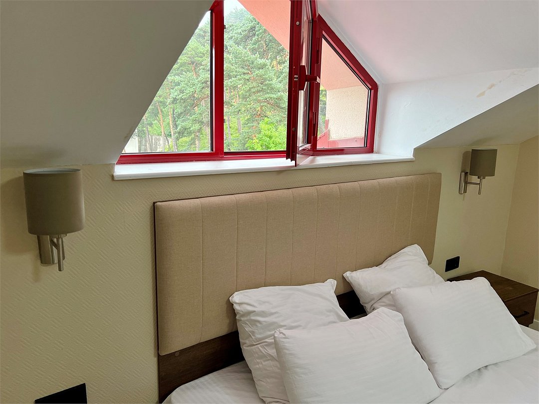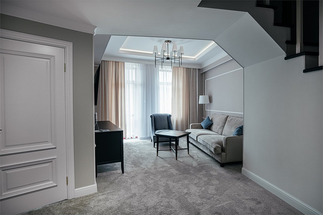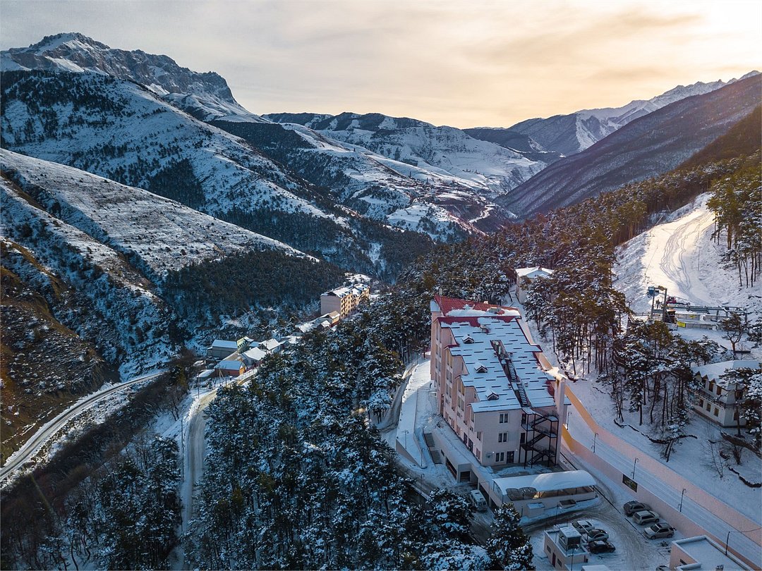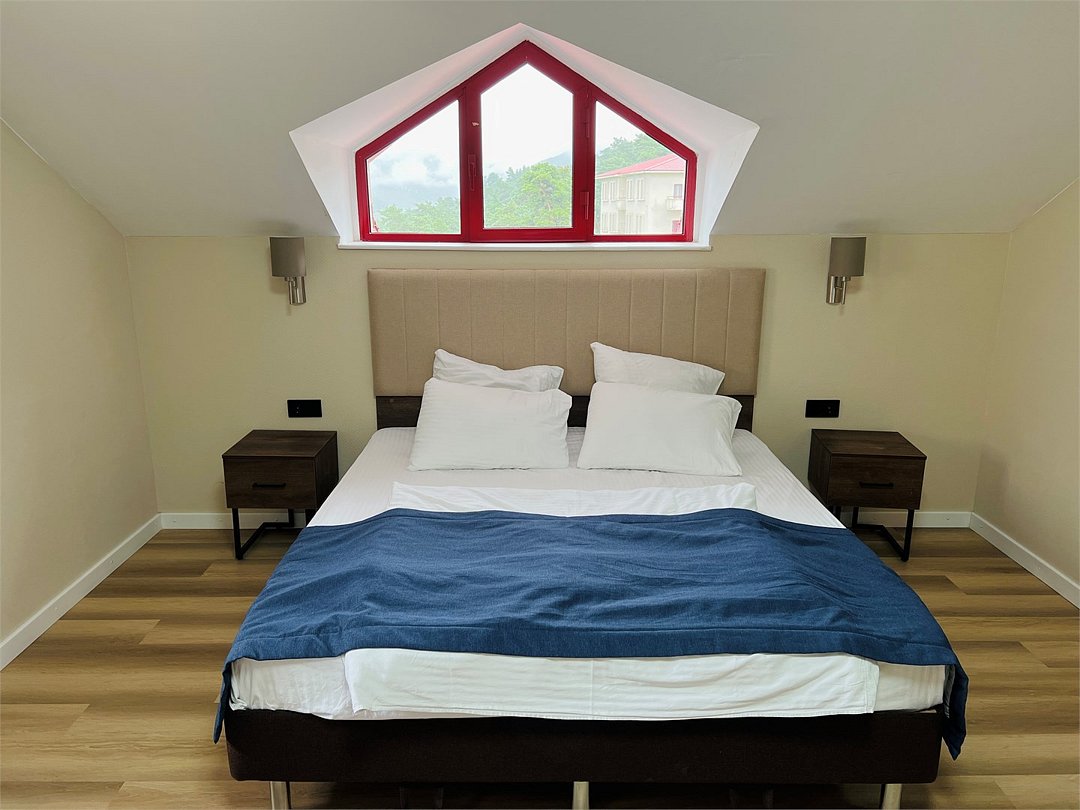 Двухэтажный четырехкомнатный номер с балконом и видом на Кавказские горы, с возможностью полного затемнения. Две двухспальных кровати, письменный стол, стул, диван и кресла. Просторная ванная комната с умывальником, косметикой для душа и ванной, зубной набор и полноразмерная ванна и холодильник. В номере имеется два телевизора, посуда, два фена, тапочки. В каждом номере из под крана течет чистая горная вода из лечебного источника. Информационная папка в номере, расскажет вам о всех имеющихся возможностях курорта и экскурсиях.Услуги и удобства