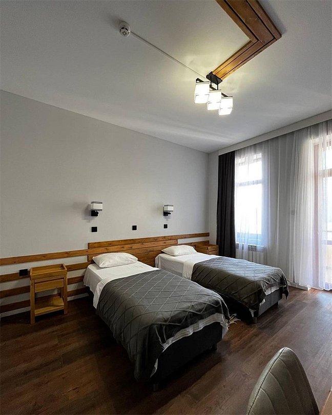 Wi-Fi, фен, утюг, обогреватель, ванная комната, ванна, санузел, водонагреватель, теплый пол, банные полотенца, гигиенические средства, балкон, балкон с красивым видом, две односпальные кровати, тумбы, шкаф для одежды, вешалки, зеркало, информационная карта, меню, чайник, унитаз, раковина, питьевая вода, отопление, отдельный вход в номер, душ, общая ванная комната, ламинат, стаканы, стул, стол, туалет, вид на горы, номер для некурящих, вид на бассейнВ гостиничном номере
