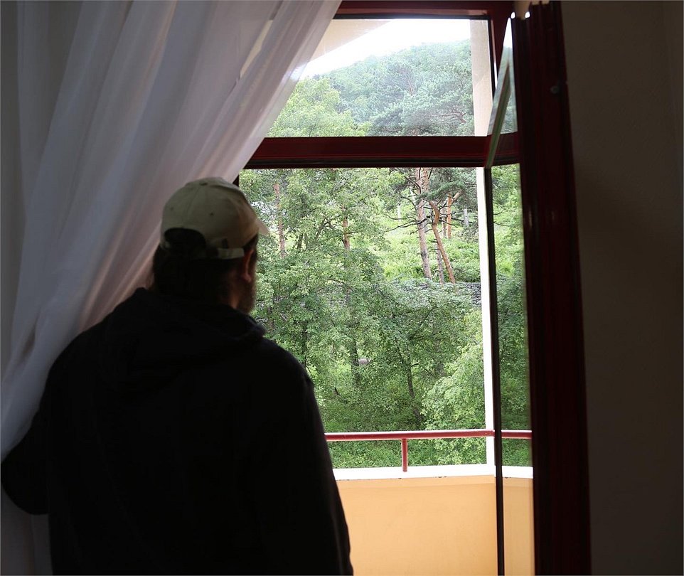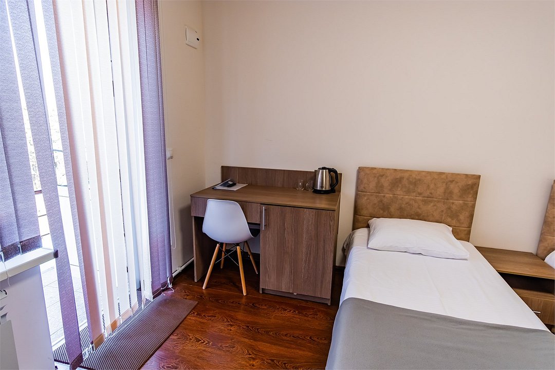 Просторный номер с окнами и балконом на курортную территорию, бассейн и Кавказские горы. Посещение бассейна включено в сезон в стоимость проживания. Две односпальных кровати, письменный стол, стулья. Ванная комната с умывальником, косметикой для душа и ванной. По требованию предоставляются фен, утюг. В каждом номере из под крана течет чистая горная вода из лечебного источника.Услуги и удобства