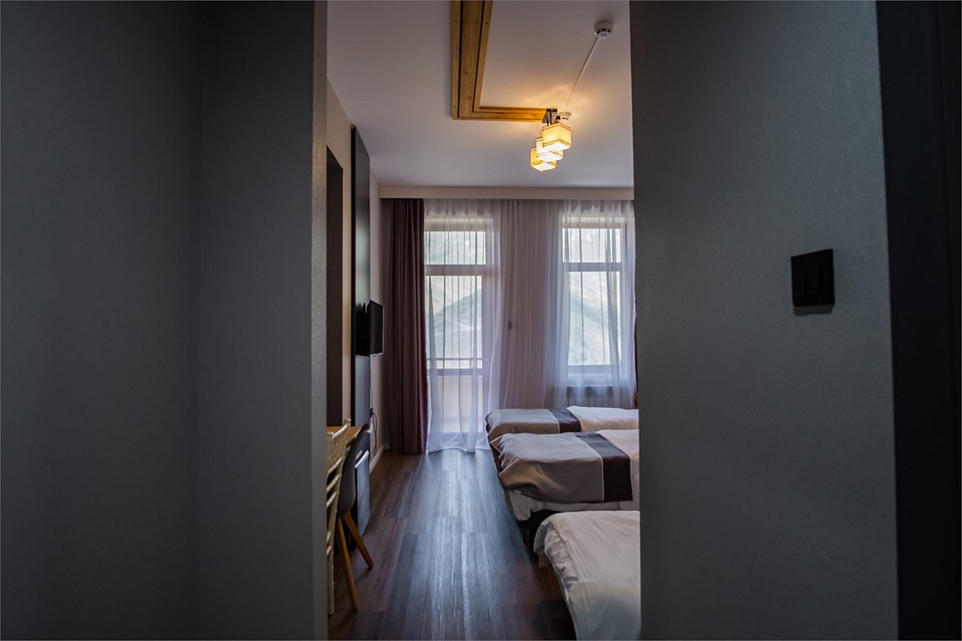 телевизор, Wi-Fi, интернет, светильник, фен, вентилятор, ванная комната, банные полотенца, гигиенические средства, косметические средства, тумбы, шкаф для одежды, вешалки, журнальный столик, зеркало, чайный набор, чайник, унитаз, раковина, питьевая вода, отдельный вход в номер, душ, кресло, три односпальные кровати, ламинат, стаканы, кофейный столик, стул, стол, туалетные средства, туалет, цифровое тв, вид на горы, номер для некурящих, гигиенический душВ гостиничном номере