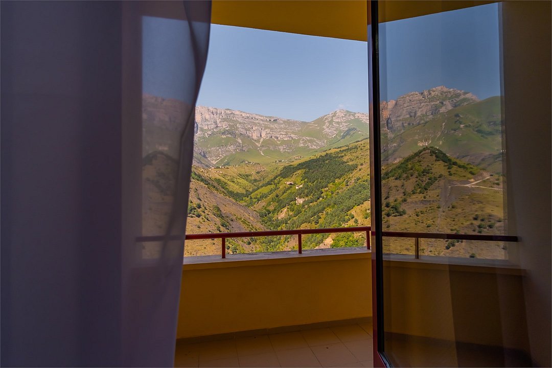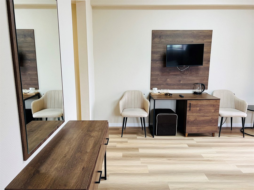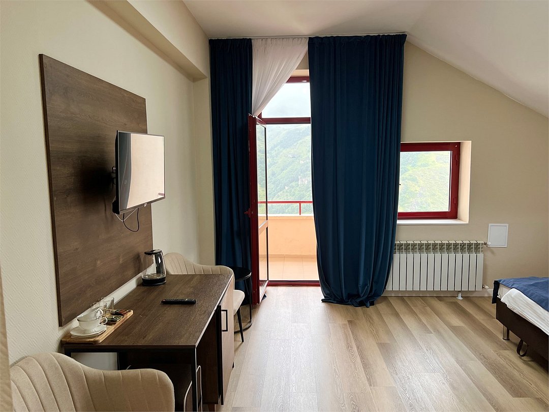 Просторный двухкомнатный номер с балконом и видом на Кавказские горы. Двухспальная кровать, диван, письменный стол, стул и кресла. Просторная ванная комната с умывальником, косметикой для ванной, зубной набор и ванна, кухня и холодильник. В номере имеется телевизор, посуда, фен, тапочки. В каждом номере из-под крана течет чистая горная вода из лечебного источника.Услуги и удобства