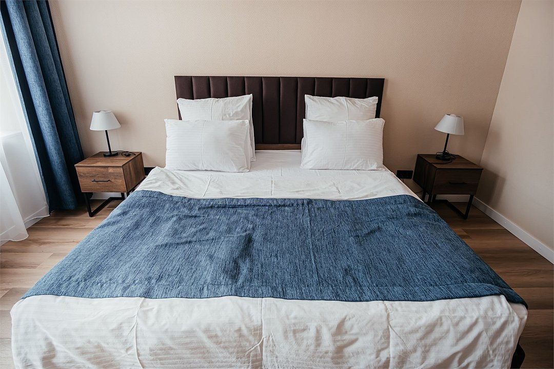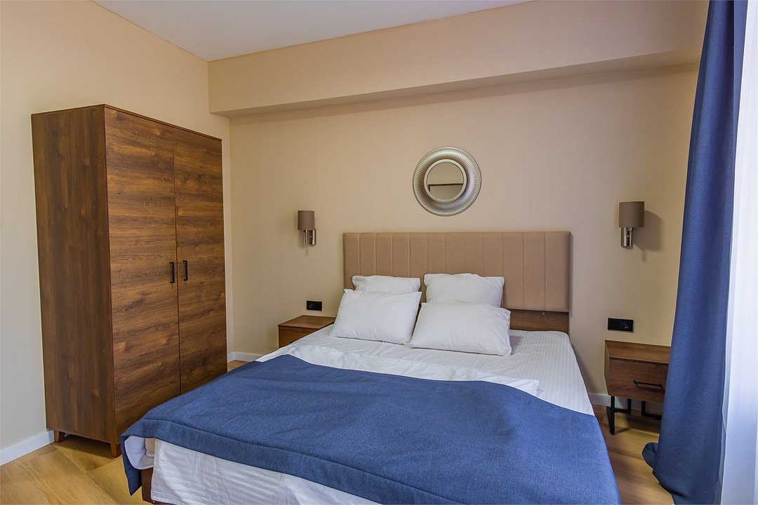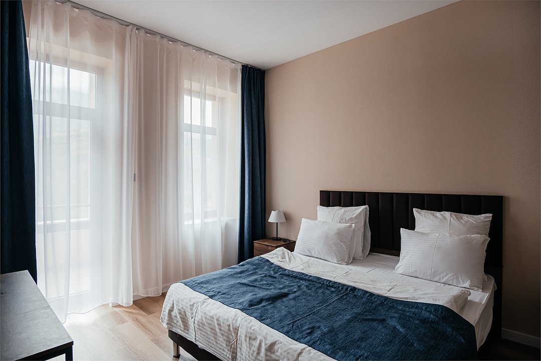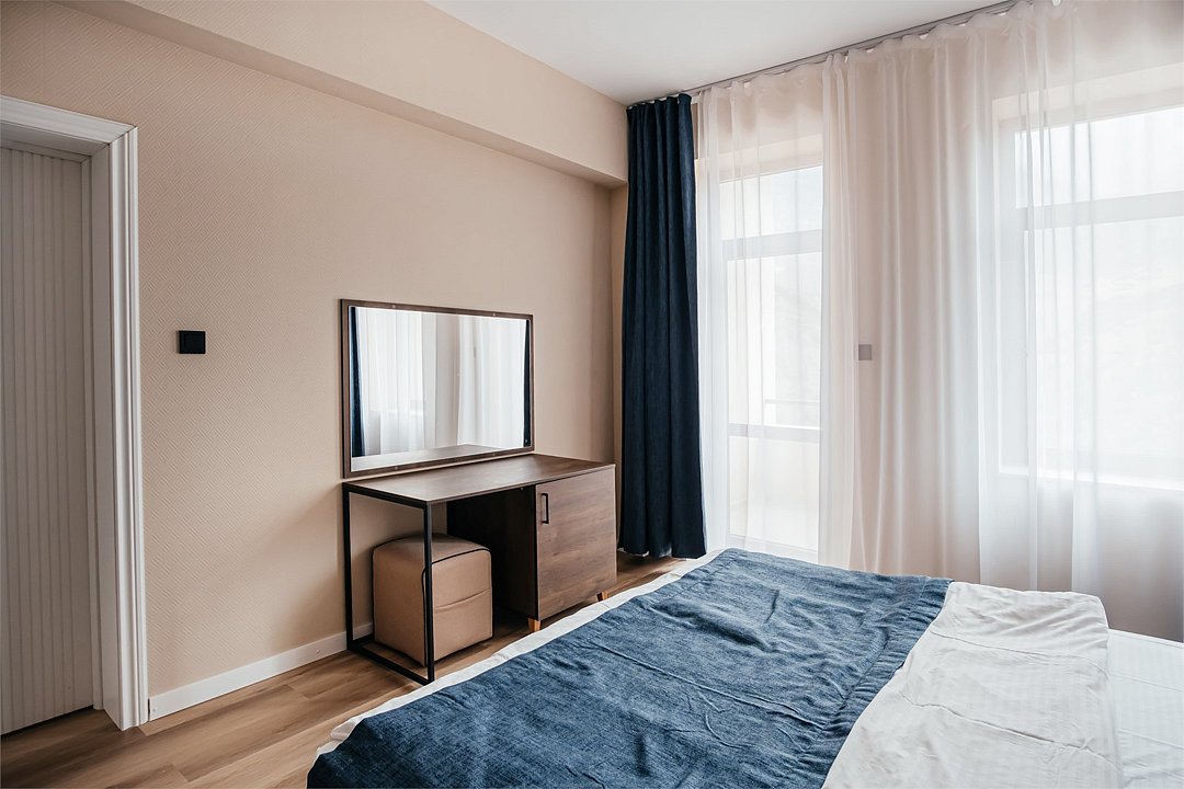 Апартаменты трехкомнатные (до 5 человек) в апарт-отеле «Берд». Две спальни и гостиная, отдельная кухня и ванная комната. Спальня #1 — двуспальная кровать, две прикроватные тумбы, плотные шторы, шкаф, трюмо+зеркало. Спальня #2 — две односпальные кровати, прикроватные тумбы, стул, плотные шторы. Гостиная — два раскладных дивана, журнальный столик, телевизор, балкон. Рядом с апартаментами оборудована общая мангальная зона. У каждого номера отдельная беседка.Двухместный Стандарт — отель «Терк»