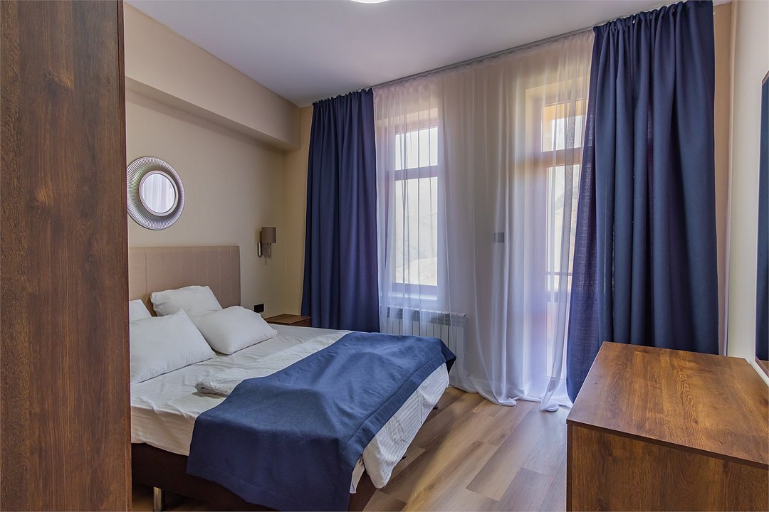 Просторный двухкомнатный номер с балконом, с которого открывается вид на Кавказские горы. Одна двуспальная кровать, угловой диван-кровать, письменный стол, стул, диван и кресла. Просторная ванная комната с умывальником, косметикой для душа и ванной, зубной набор и полноразмерная ванна и холодильник. В номере имеется телевизор, чайник, фен, тапочки. Возможность полного затемнения. В каждом номере из под крана течет чистая горная вода из лечебного источника. Информационная папка в номере расскажет вам о всех имеющихся возможностях курорта и экскурсиях.Услуги и удобства