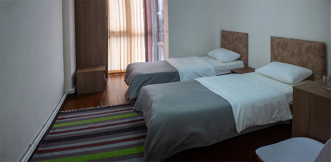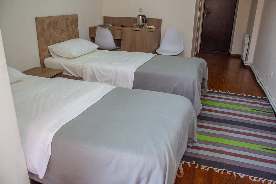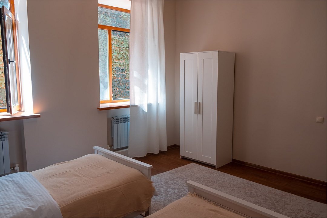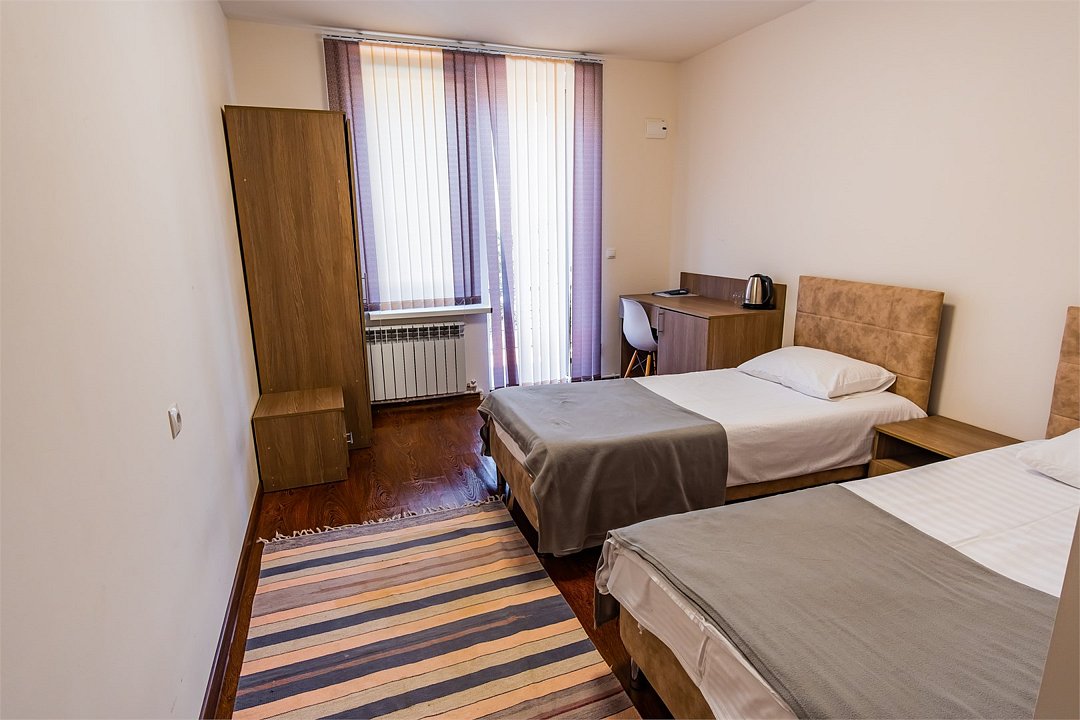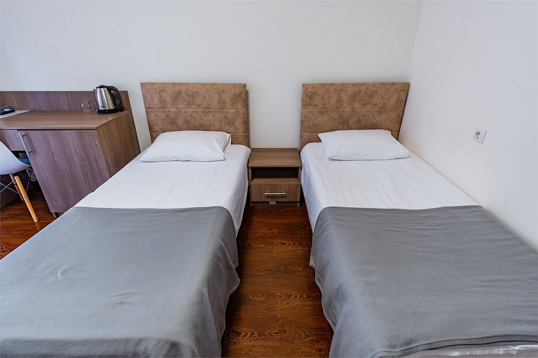 Wi-Fi, фен, утюг, обогреватель, ванная комната, ванна, санузел, теплый пол, банные полотенца, гигиенические средства, балкон, балкон с красивым видом, две односпальные кровати, тумбы, шкаф для одежды, вешалки, зеркало, информационная карта, меню, чайник, унитаз, раковина, питьевая вода, отопление, отдельный вход в номер, душ, общая ванная комната, вид во двор, ламинат, стаканы, стул, стол, вид на горы, номер для некурящихВ гостиничном номере