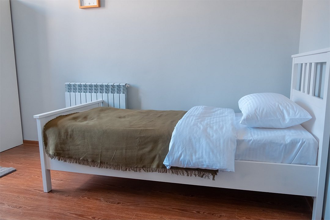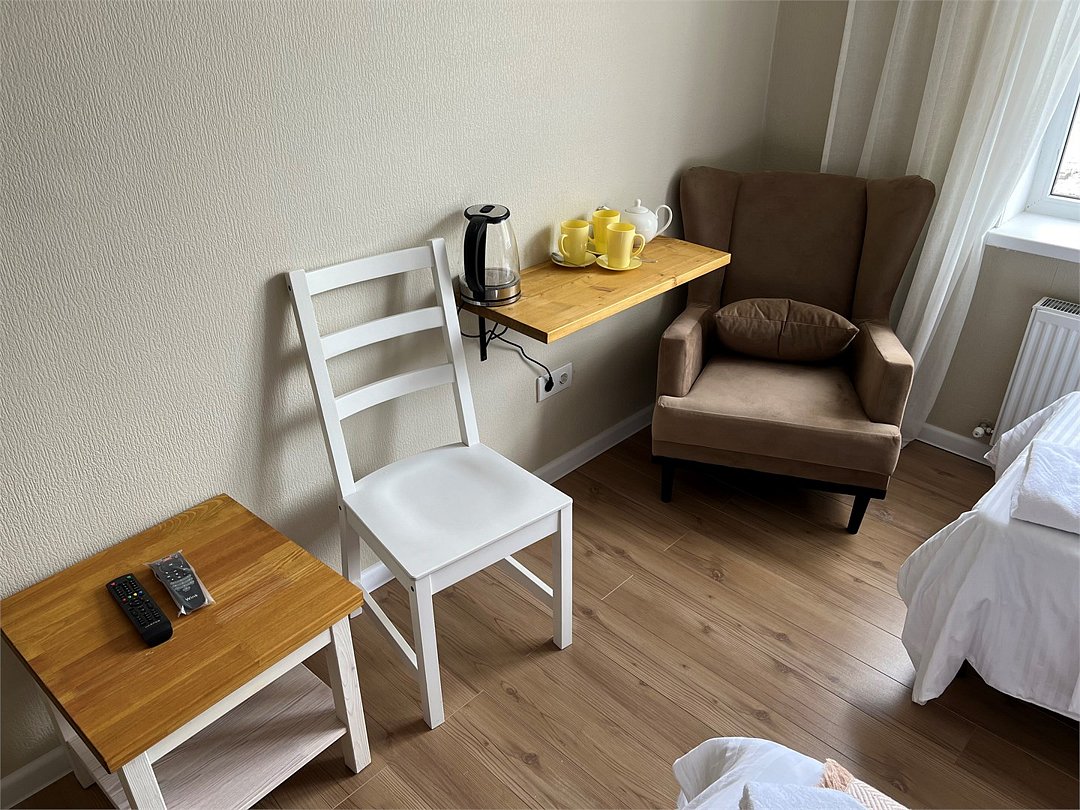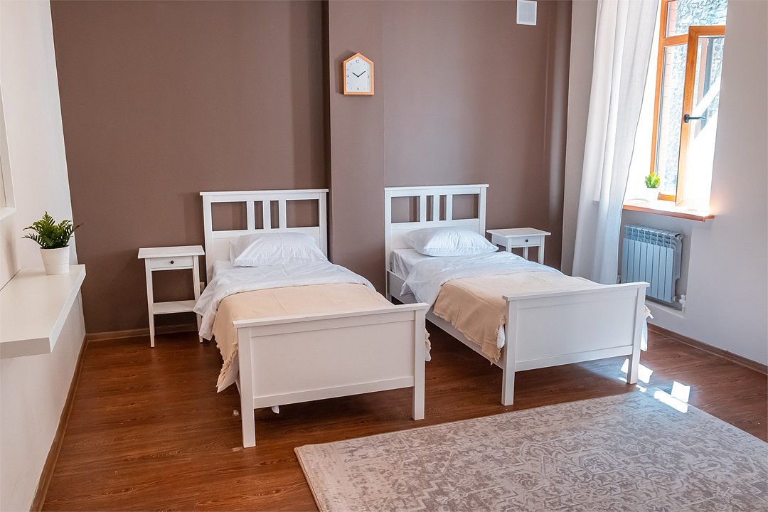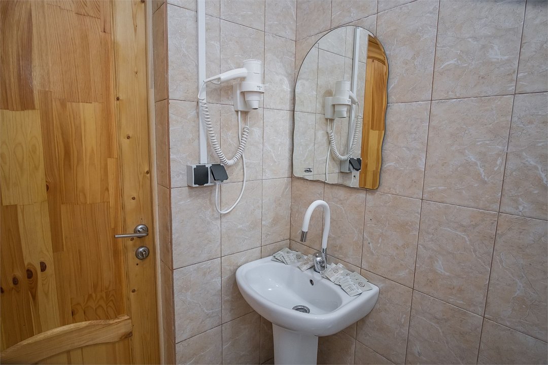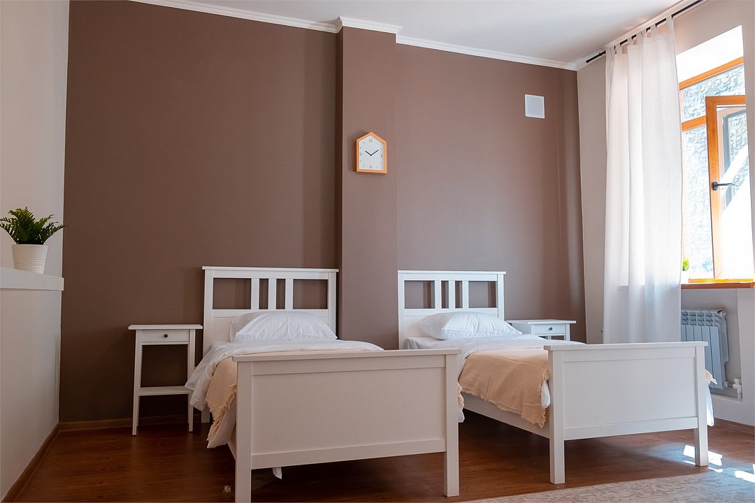 Wi-Fi, фен, утюг, обогреватель, ванная комната, ванна, санузел, теплый пол, банные полотенца, гигиенические средства, балкон, балкон с красивым видом, две односпальные кровати, тумбы, шкаф для одежды, вешалки, зеркало, информационная карта, меню, чайник, унитаз, раковина, питьевая вода, отопление, отдельный вход в номер, душ, общая ванная комната, вид во двор, ламинат, стаканы, стул, стол, вид на горы, номер для некурящихВ гостиничном номере
