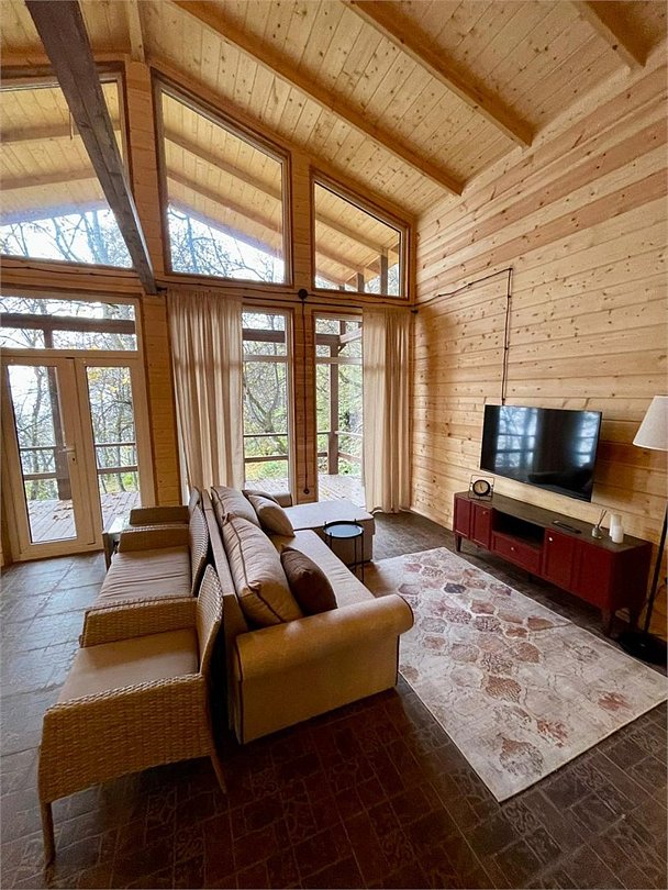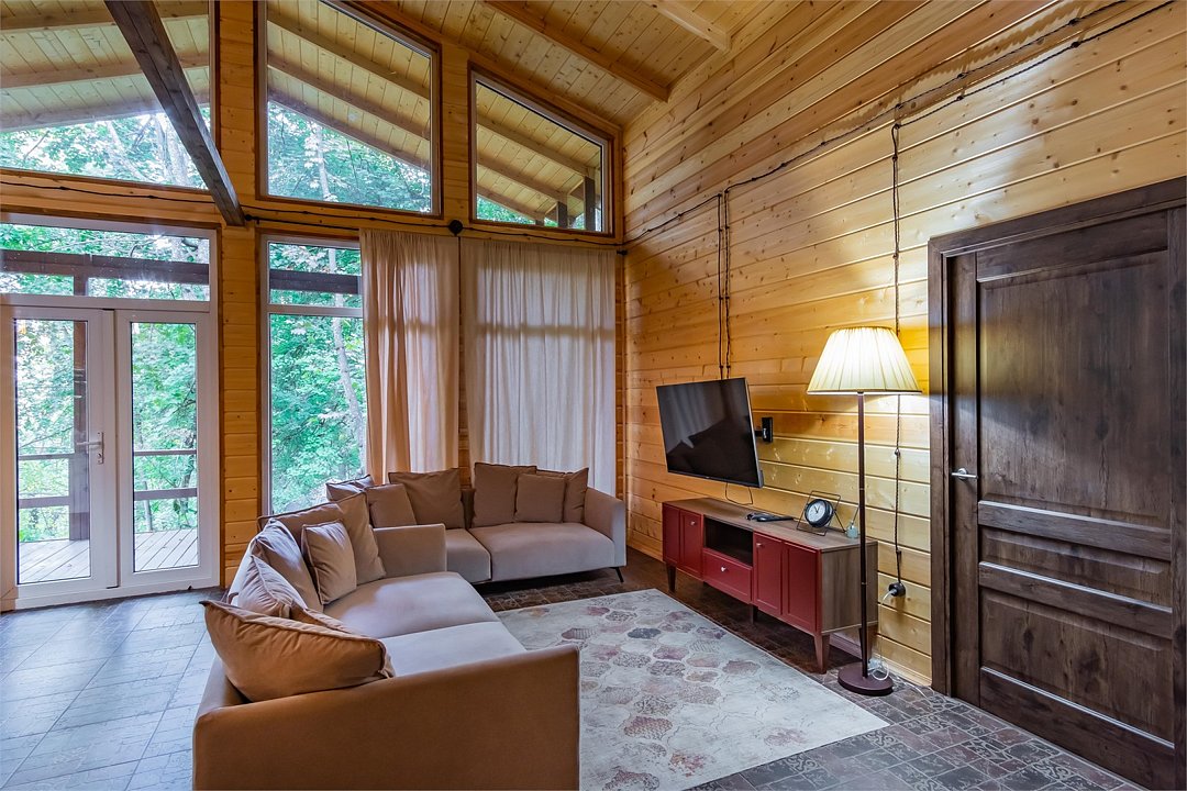 телевизор, кабельное телевидение, Wi-Fi, холодильник, санузел, банные полотенца, гигиенические средства, балкон, балкон с красивым видом, диван, тумбы, стулья, шкаф для одежды, обеденный стол, зеркало, комод, набор посуды, информационная карта, меню, чайник, унитаз, раковина, отопление, отдельный вход в номер, душ, раздельный санузел, четыре односпальные кровати, мангал, вид на горы, вид на лесВ коттедже