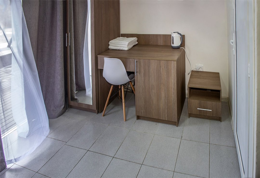 Номер в новом корпусе annex building «Терк», выполненный в современном стиле прованс. Вход в номера осуществляется с улицы по открытому коридору первого и второго этажей. Из номеров открывается вид на Столовую горуУслуги и удобства
