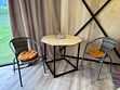 На террасе с потрясающим видом столик с креслами.