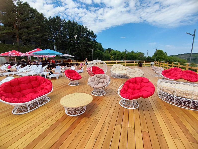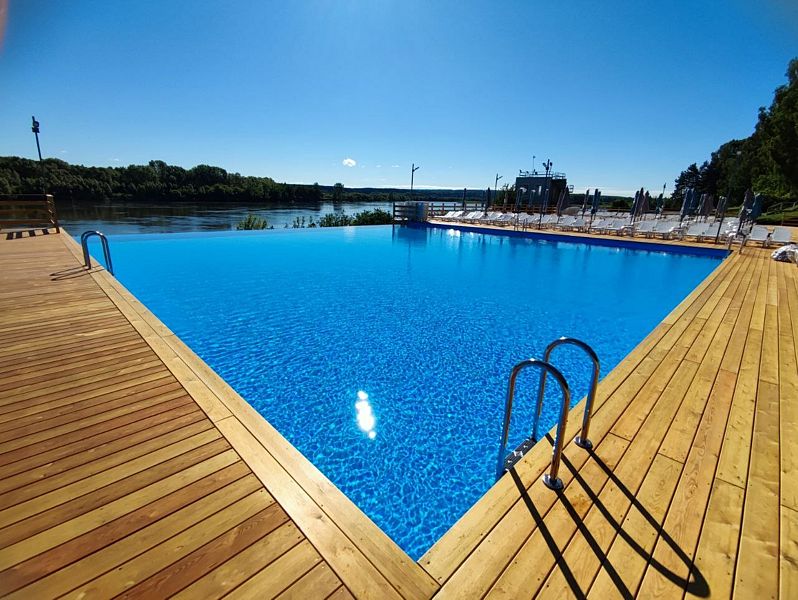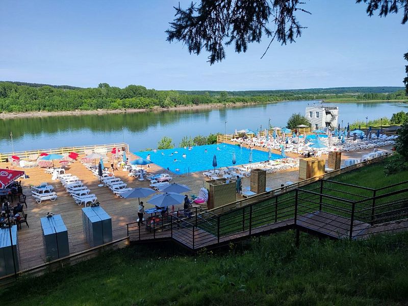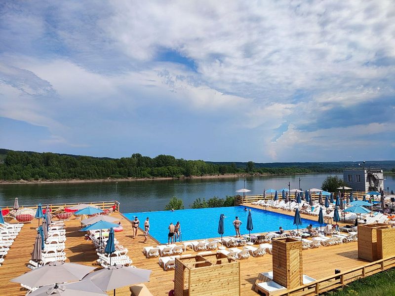 Инфраструктура: лежаки, зонтики, шезлонги, спасательПляж Притомье — огромная терраса на берегу реки с двумя теплыми, подогреваемыми бассейнами — взрослым и детским. Общая площадь возведенной террасы составляет 2000 кв.м.