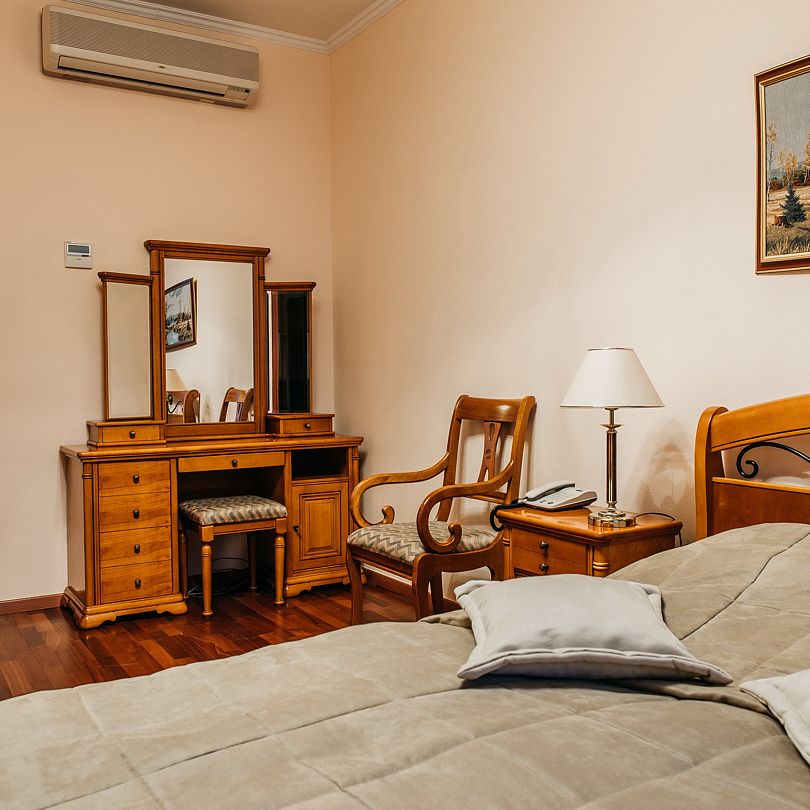 Стандартный номер в главном корпусе, с двумя односпальными кроватями. Санузел с душевой кабиной, телевизор, холодильник, чайник. Фотографии номеров могут отличаться.