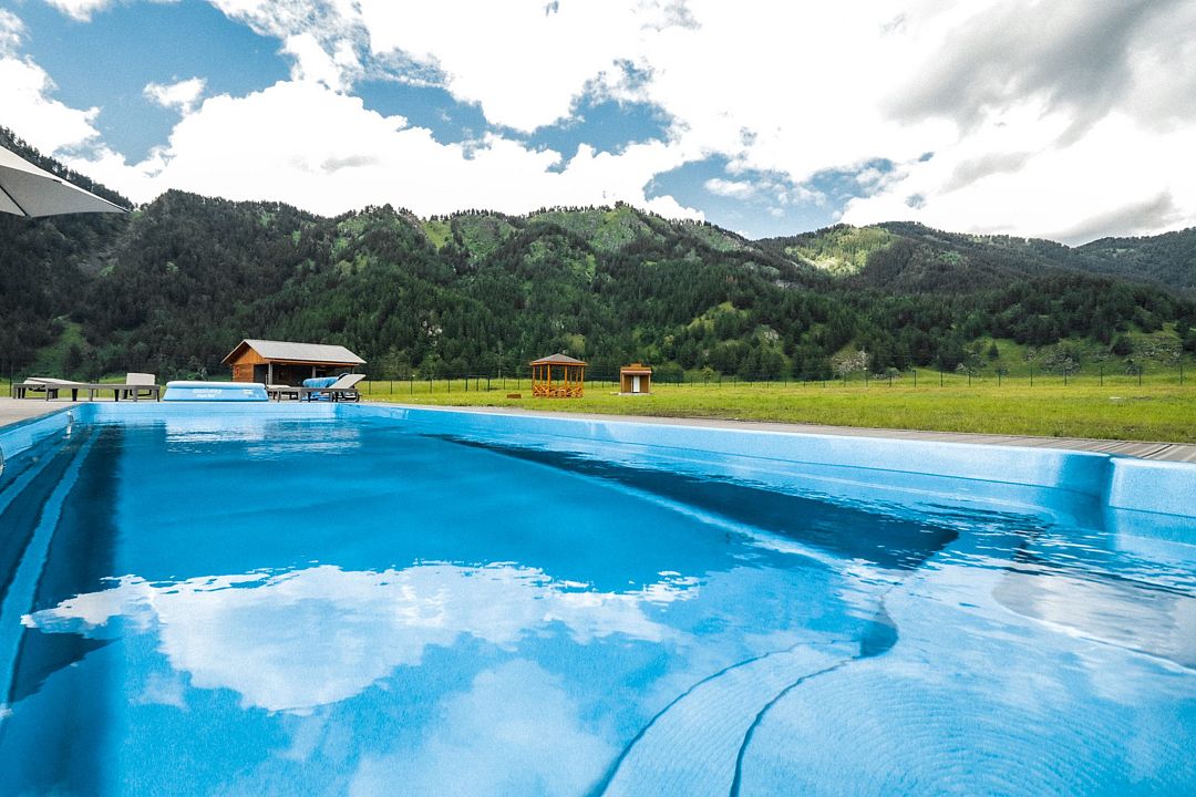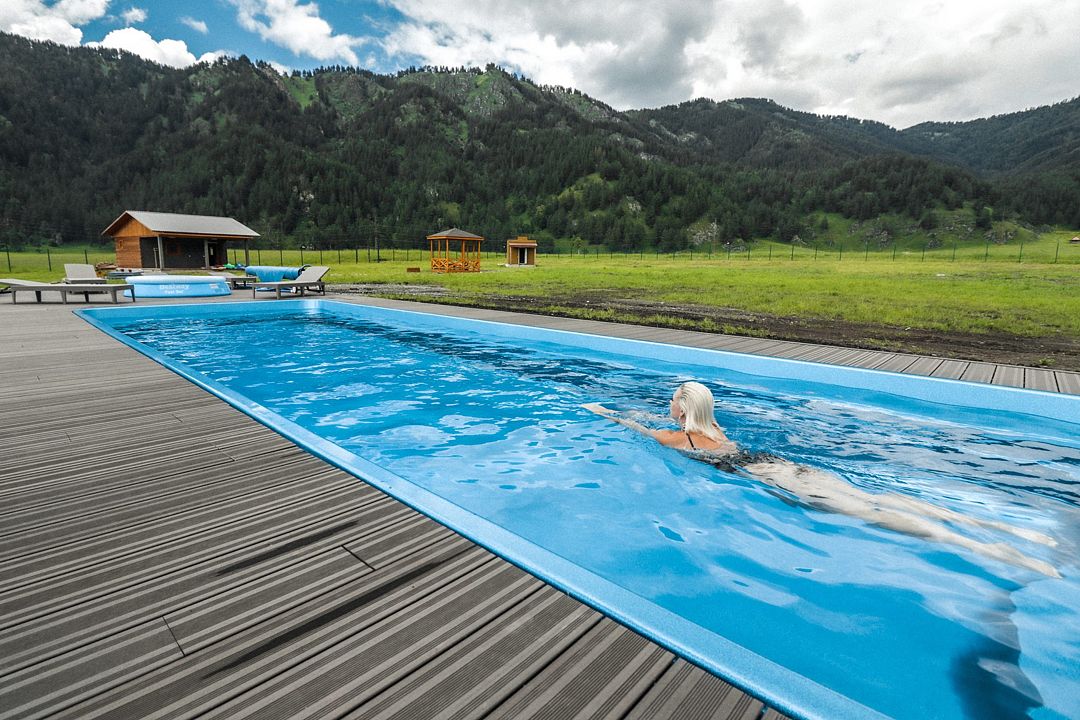 Тип бассейна: открытый бассейнПериод работы: летний сезонВ самом центре нашего посёлка строится новый большой бассейн. В ближайшее время он будет запущен. А пока, мы приглашаем вас на открытый летний бассейн при отеле Ранчо Техас, это минут 7 ходьбы от коттеджа. Здесь можно не только купаться и загорать на лежаках. На площадке бассейна есть бар, пиццерия, кальянная и кинотеатр под открытым небом. Представьте себе – солнце, горы и полный релакс!