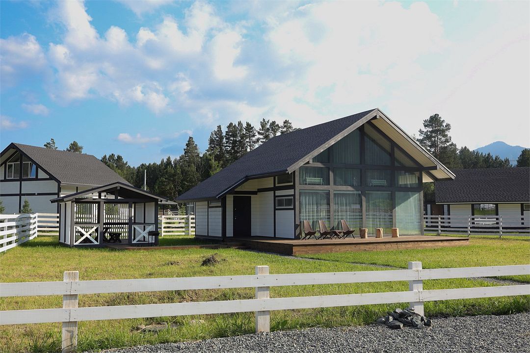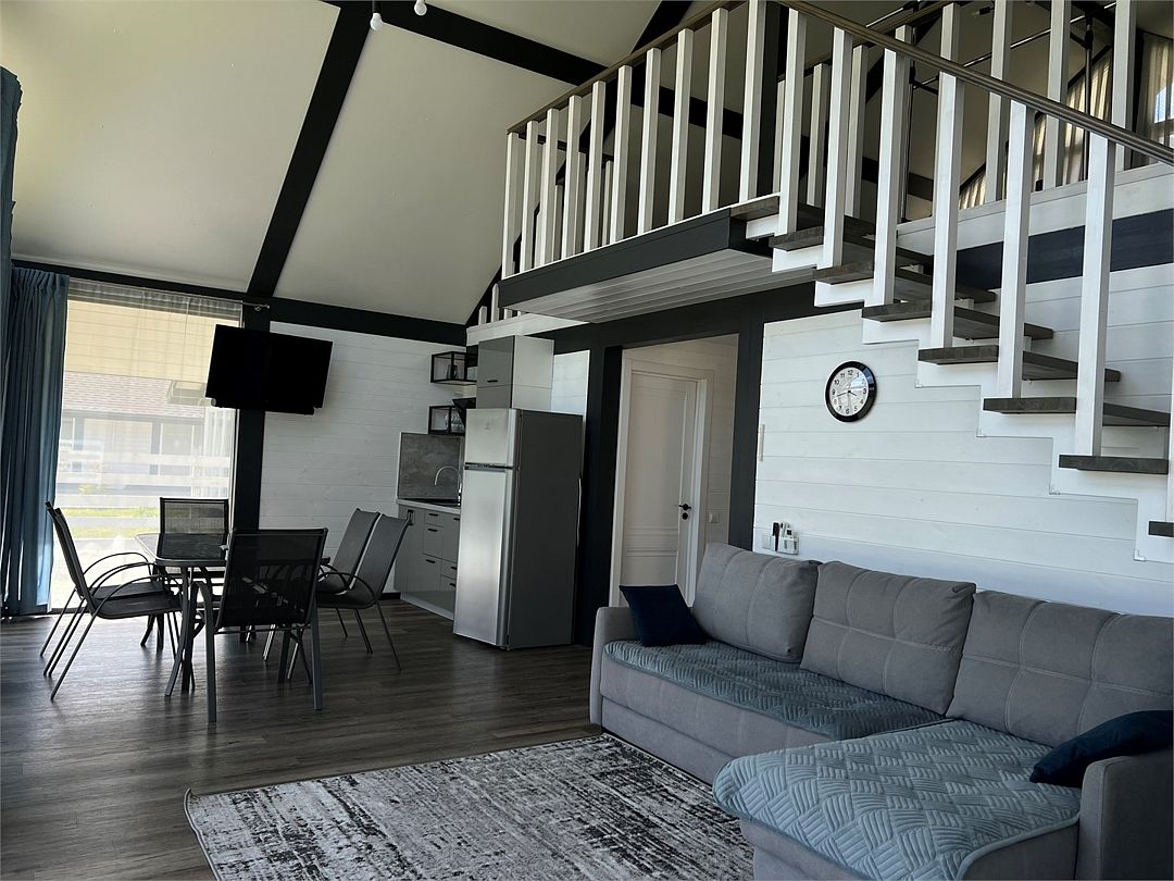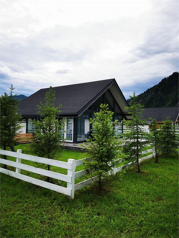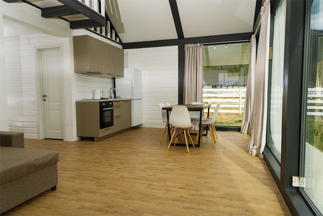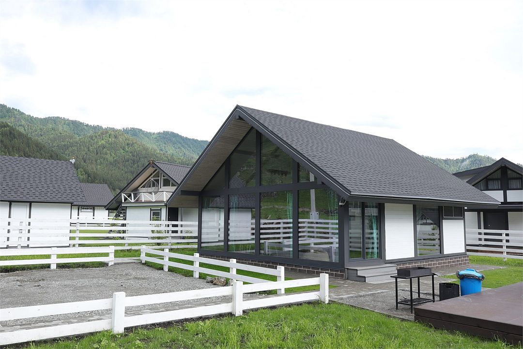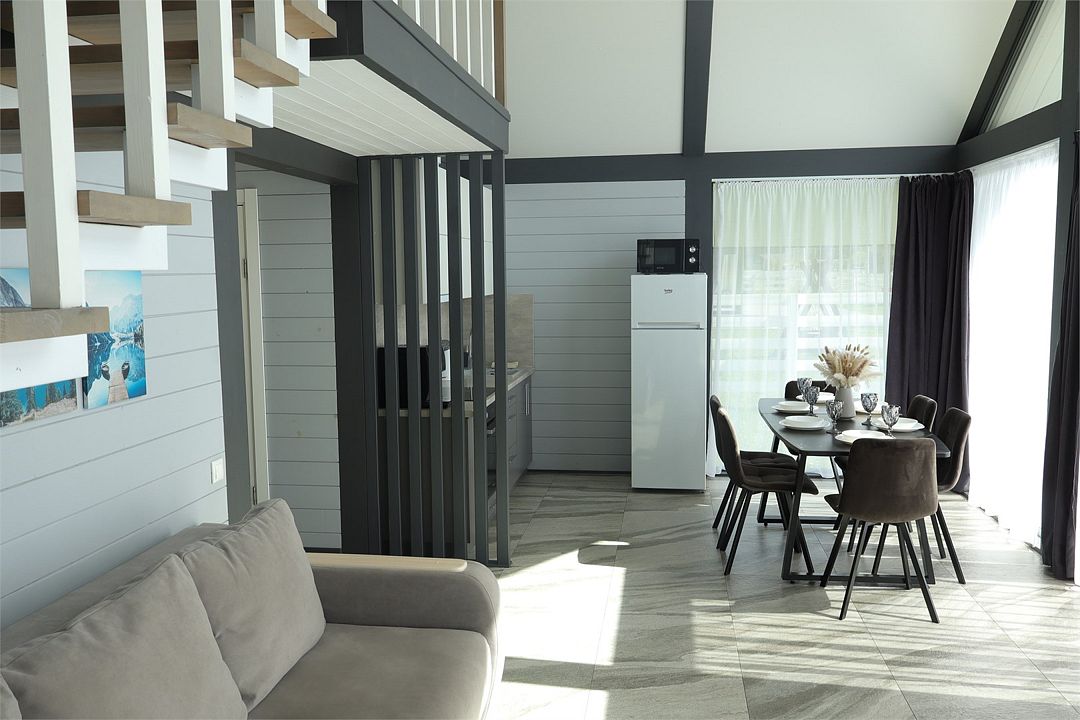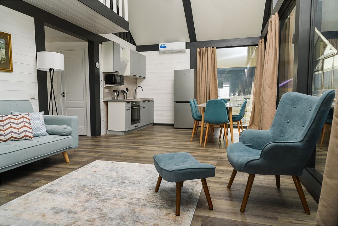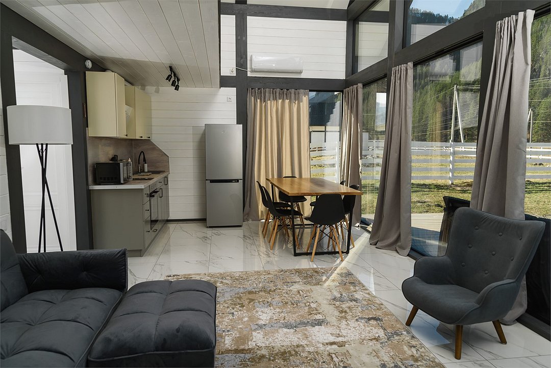 Комплекс включает в себя стильные двухэтажные коттеджи, у каждого есть собственный огороженный участок. В домах имеется все необходимое как для краткосрочного, так и для длительного проживания: объединенная с гостиной кухня, оборудованная техникой и посудой, уютные спальни, ванная комната с душевой кабиной, феном и туалетные принадлежностями. В каждом коттедже своя терраса, откуда открываются красивые виды. Для любителей мяса на углях на участке оборудована мангальная зона и беседка, на некоторых территориях имеются качели и установлены банный чан.