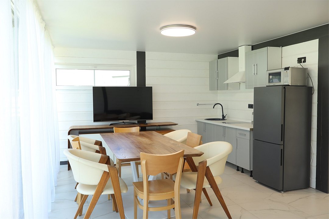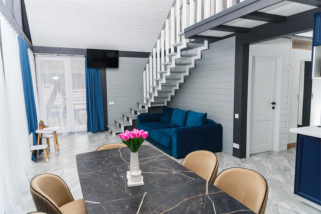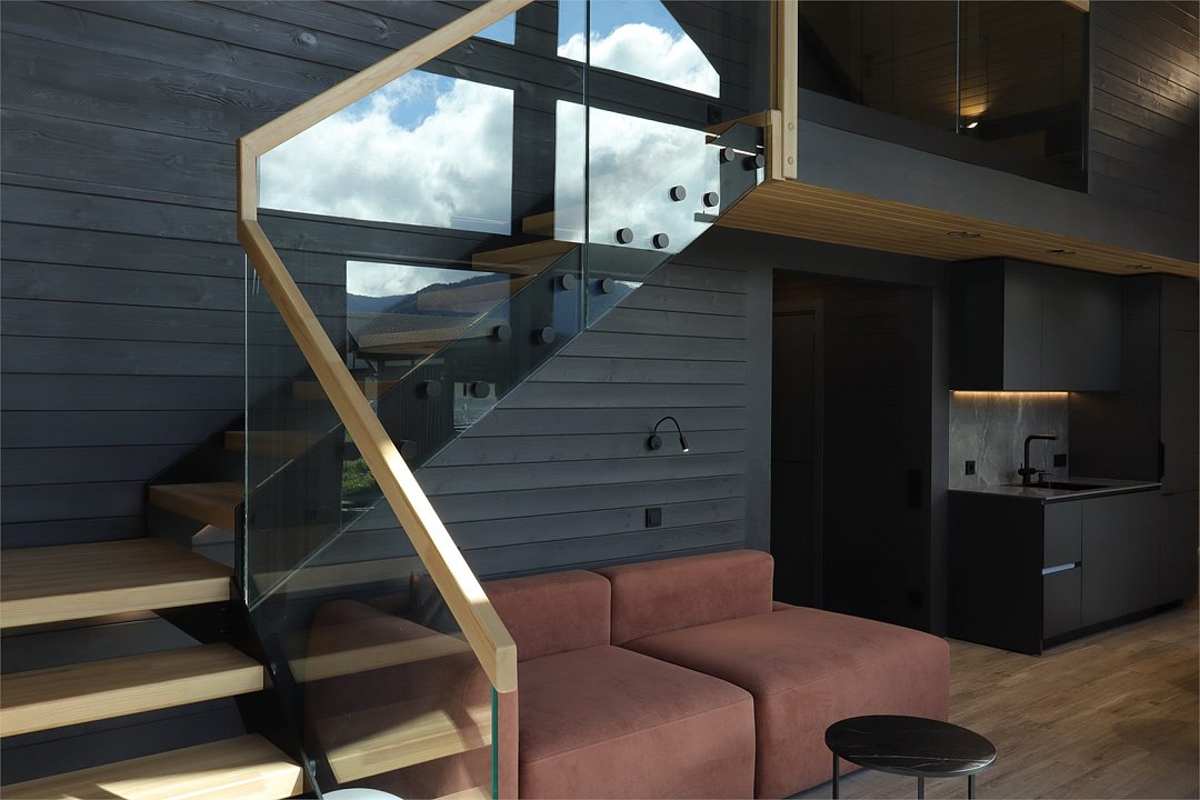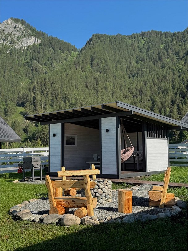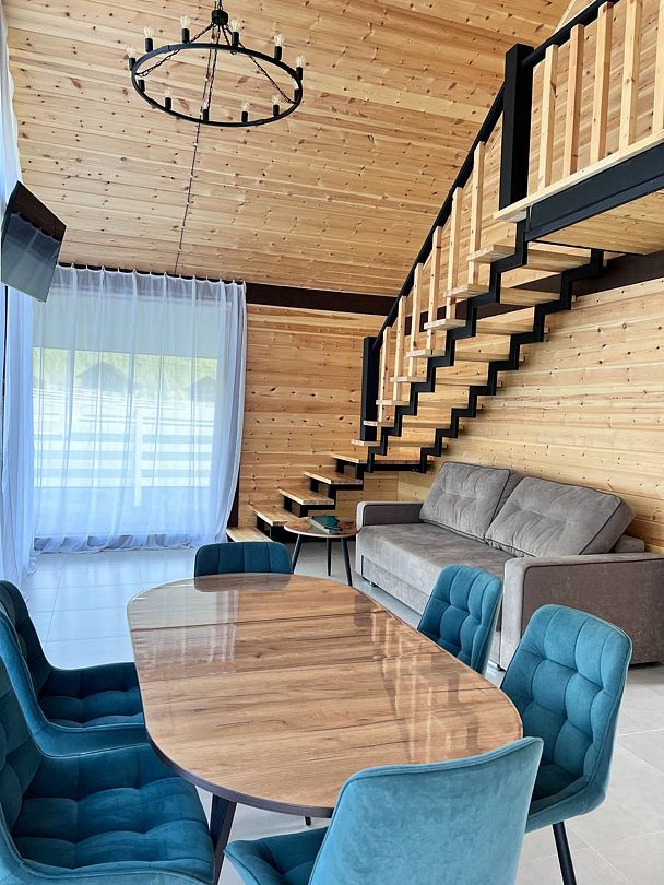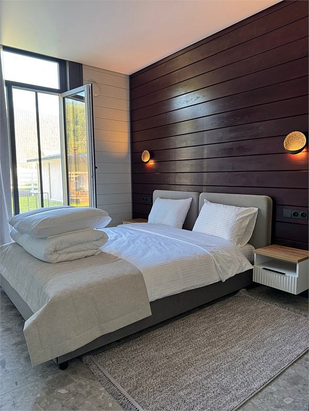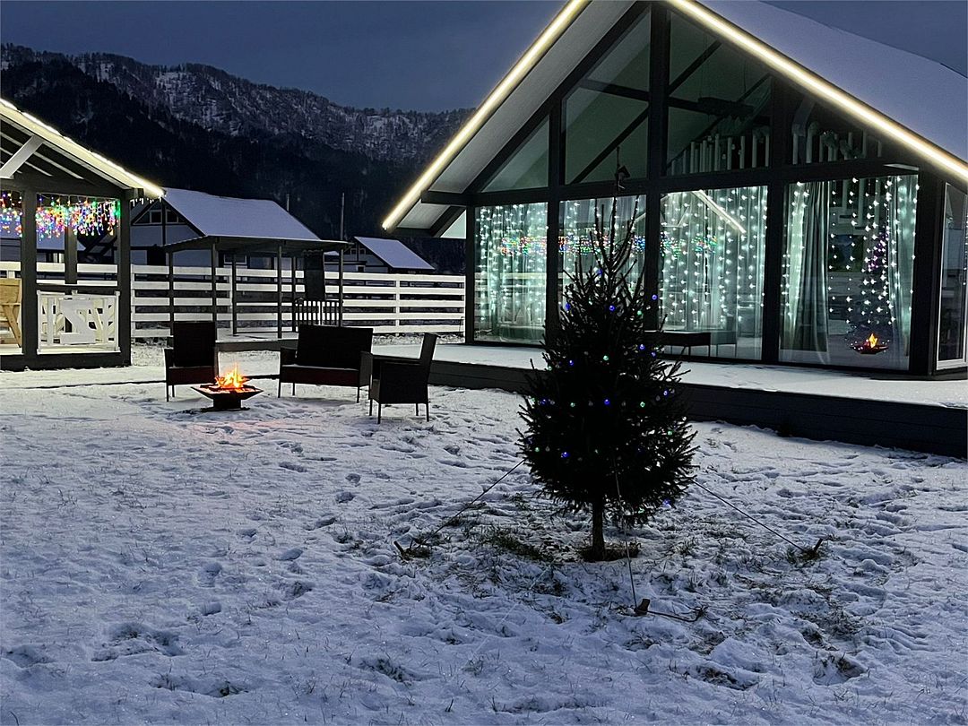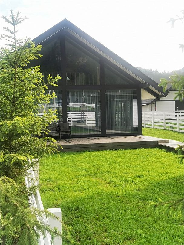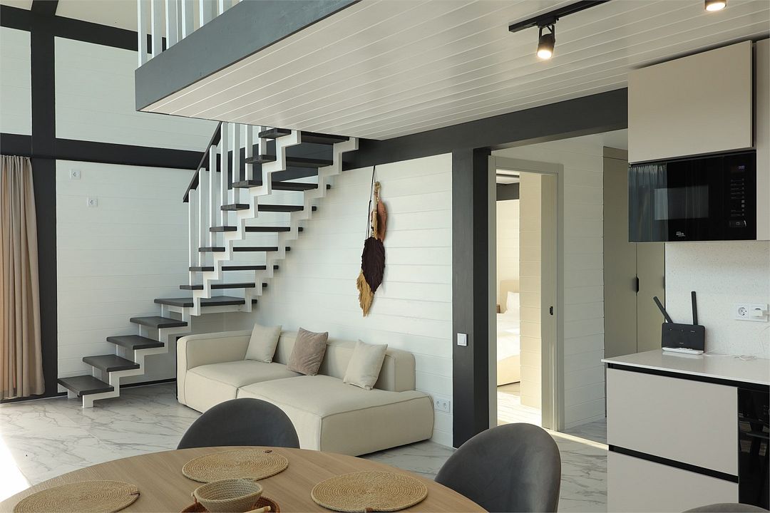 Комплекс включает в себя стильные двухэтажные коттеджи, у каждого есть собственный огороженный участок. В домах имеется все необходимое как для краткосрочного, так и для длительного проживания: объединенная с гостиной кухня, оборудованная техникой и посудой, уютные спальни, ванная комната с душевой кабиной, феном и туалетные принадлежностями. В каждом коттедже своя терраса, откуда открываются красивые виды. Для любителей мяса на углях на участке оборудована мангальная зона и беседка, на некоторых территориях имеются качели и установлены банный чан.