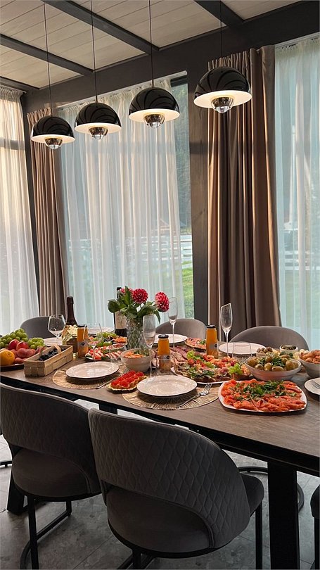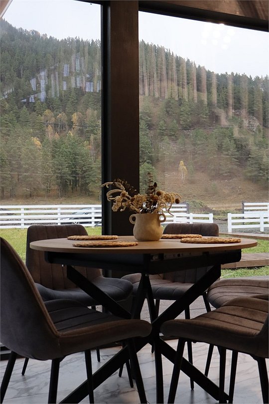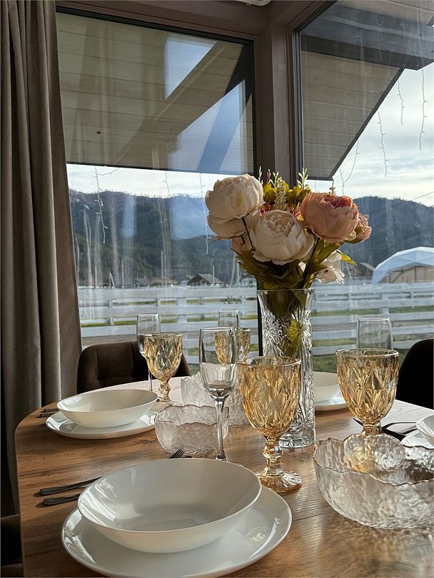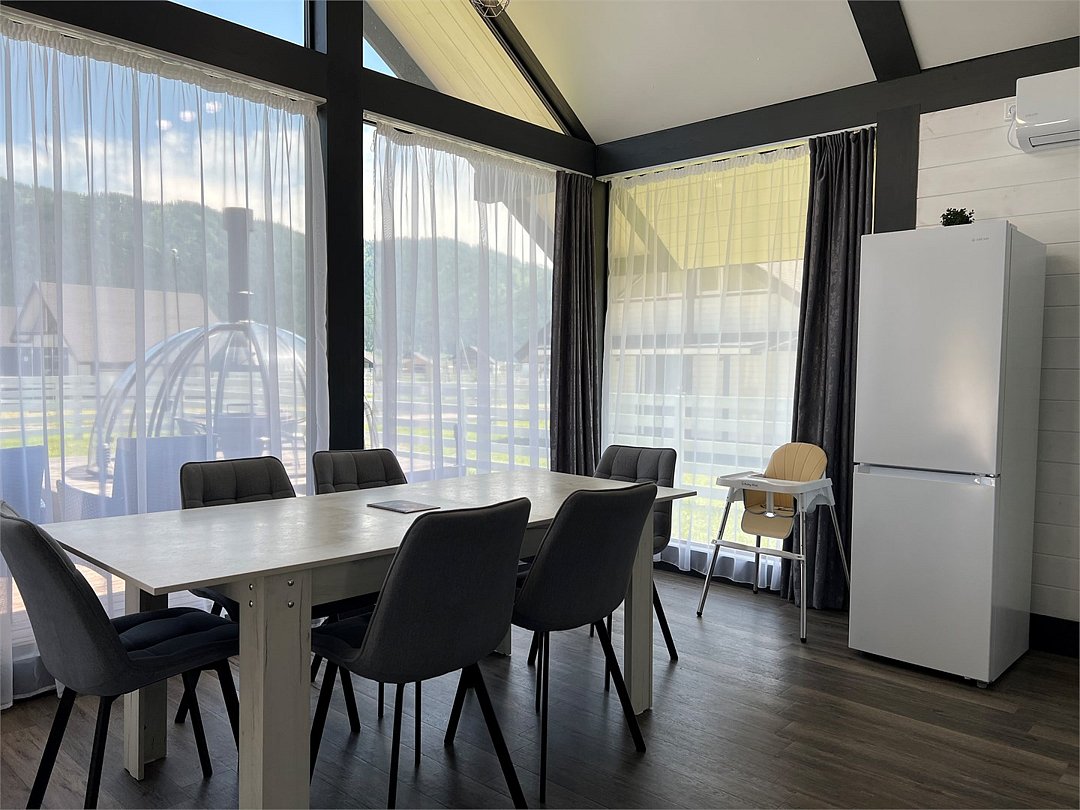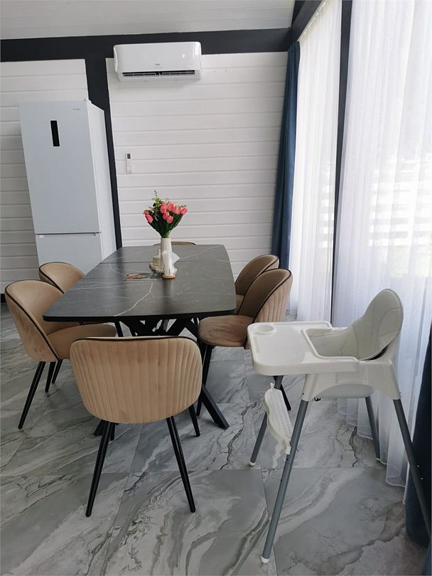 телевизор, Wi-Fi, холодильник, кондиционер, фен, плита для приготовления пищи, кофемашина, микроволновая печь, утюг, душевая кабина, теплый пол, банные полотенца, гигиенические средства, две двуспальные кровати, детская кровать, стулья, вешалки, посудомоечная машина, стиральная машина, чайник, унитаз, раковина, вид во двор, стол, диван-кровать, раскладной диван, вид на горы, стульчик для кормления ребенка, можно с питомцамиВ коттедже