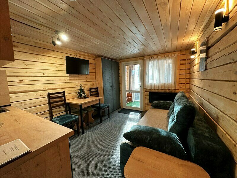 Двуспальная кровать, раскладной диван, телевизор, кухня (холодильник, чайник, микроволновая печь, набор посуды), с/у с душевой.