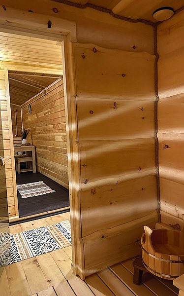 Кедровая фитобочка (парение с аромафитосбором алтайских трав) находится в банном комплексе.