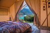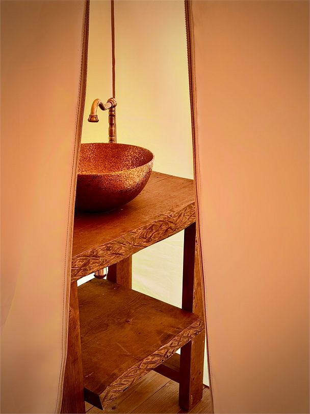 В тент-доме имеется кровать (дабл/твин), белое постельное белье, полотенца, плед и декоративные подушки, кресла на террасе. Кроме того, внутри расположены душ и раковина.
