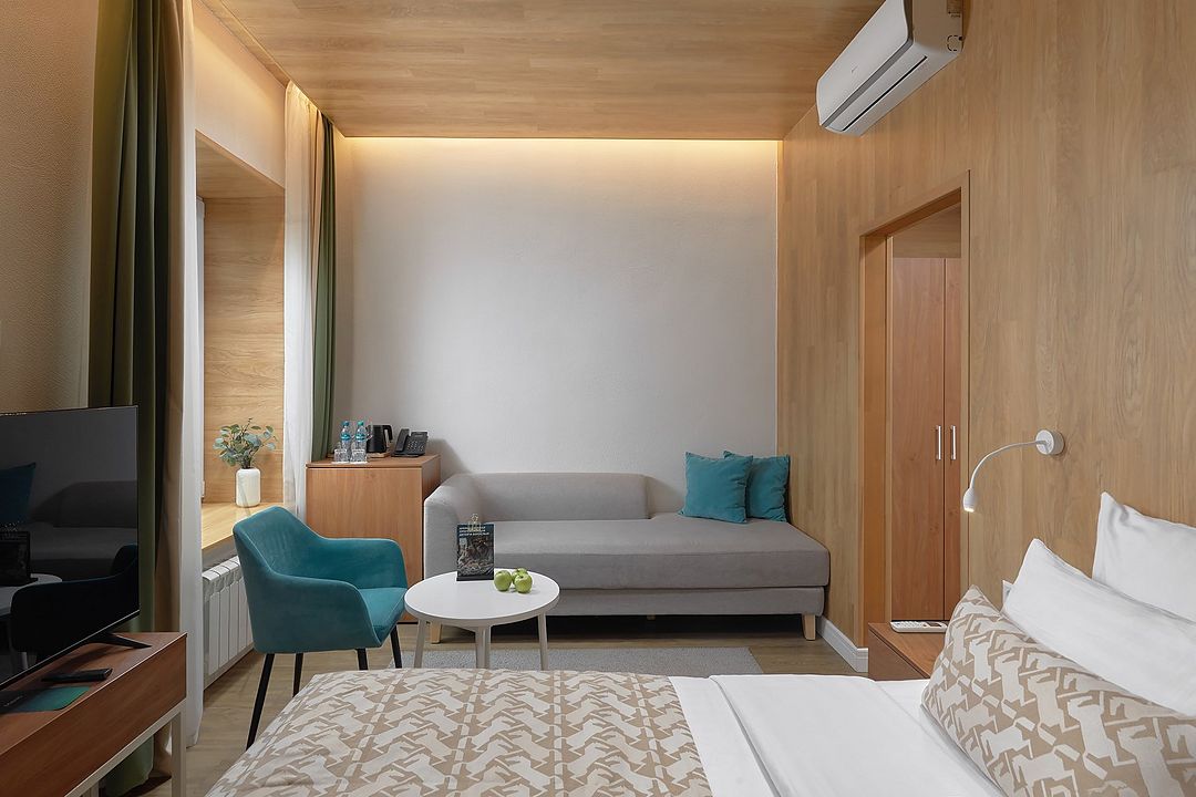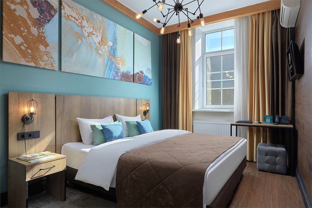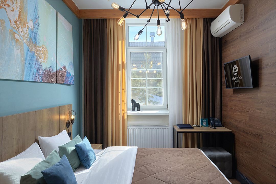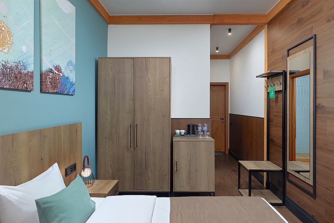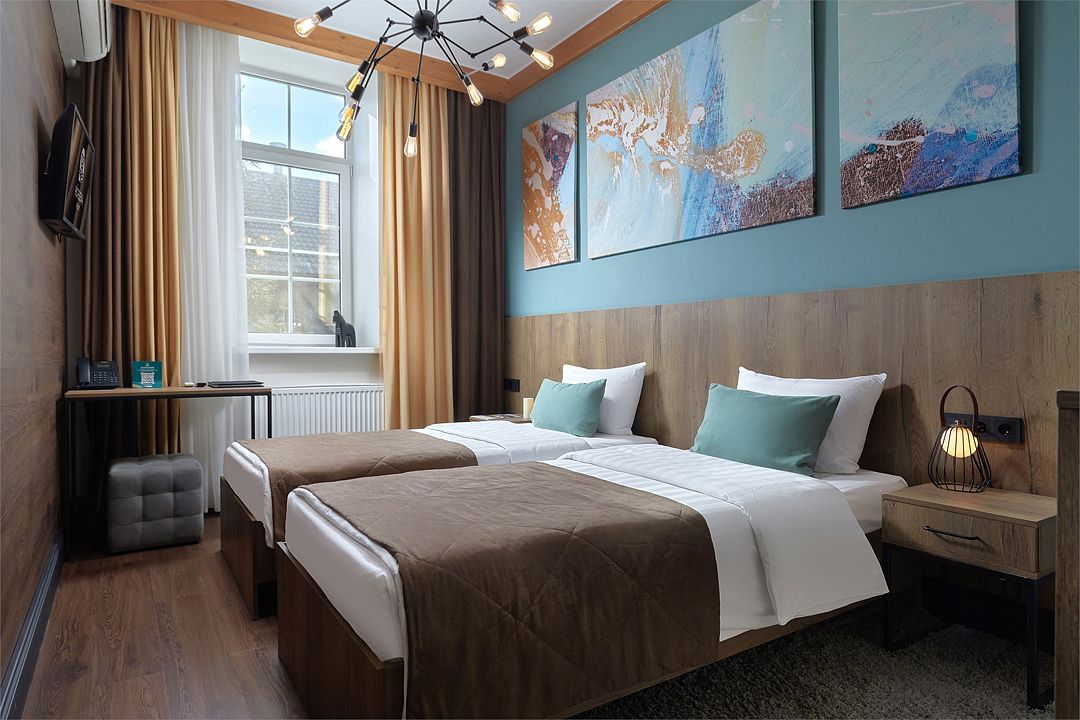 Однокомнатный комфортабельный и уютный номер, можно выбрать одну двуспальную или две раздельные кровати (уточнить наличие можно в гостинице), телевизор, шкаф, а также просторная душевая комната. Характеристики номеров могут отличаться.