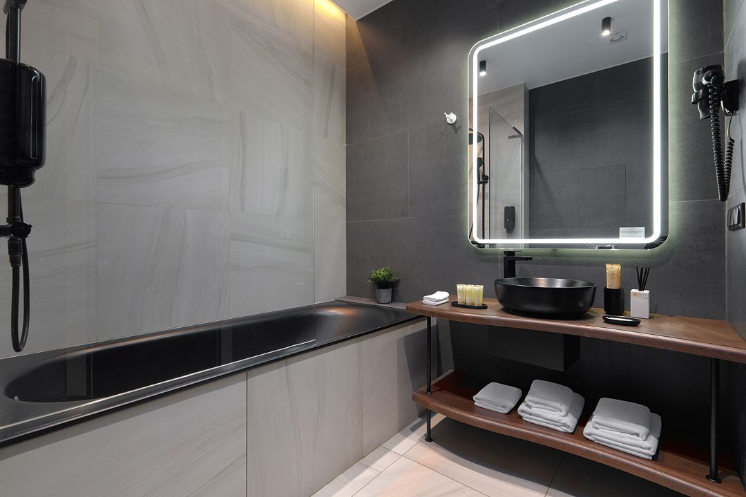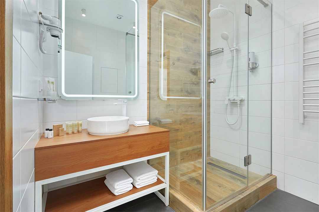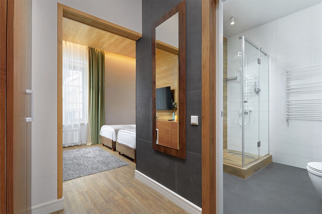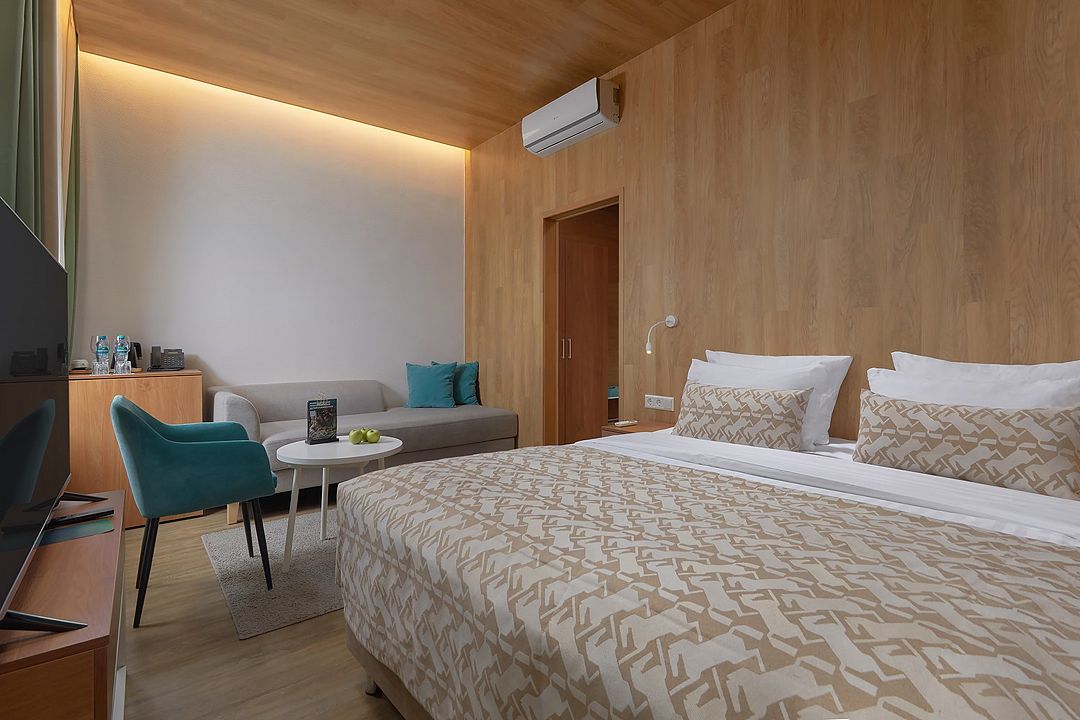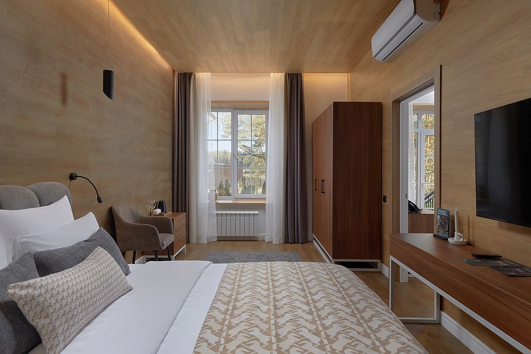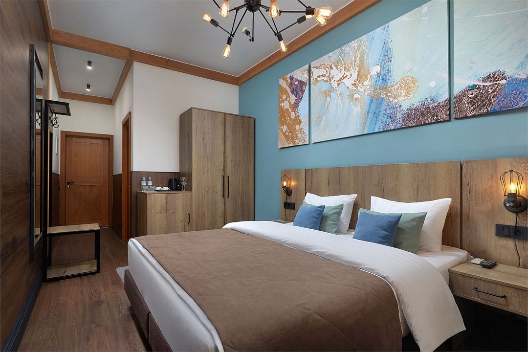 Однокомнатный комфортабельный и уютный номер, можно выбрать одну двуспальную или две раздельные кровати (уточнить наличие можно в гостинице), телевизор, шкаф, а также просторная душевая комната. Характеристики номеров могут отличаться.