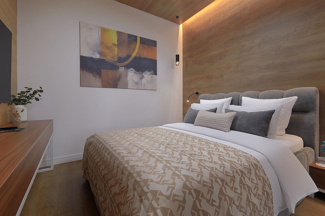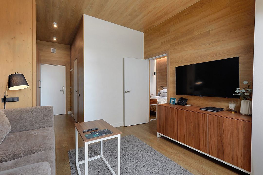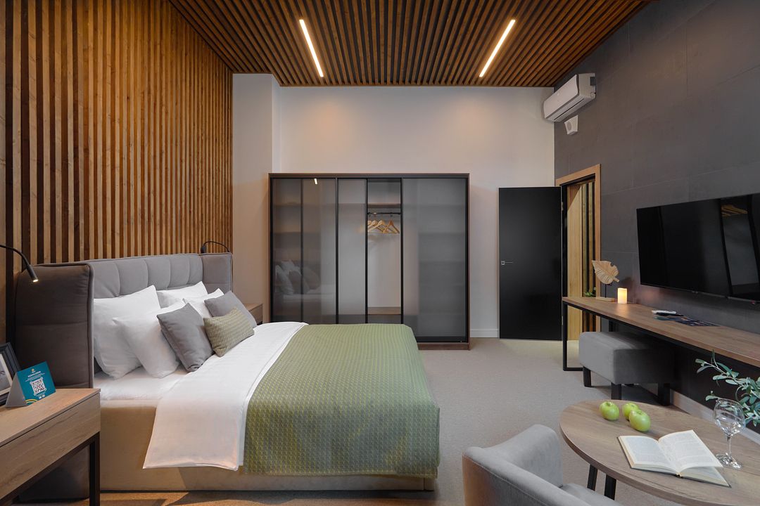 Просторный номер с высокими потолками. На выбор двухкомнатный номер или номер-студио, с ванной или душевой кабиной. В комнате одна большая кровать и зона отдыха.