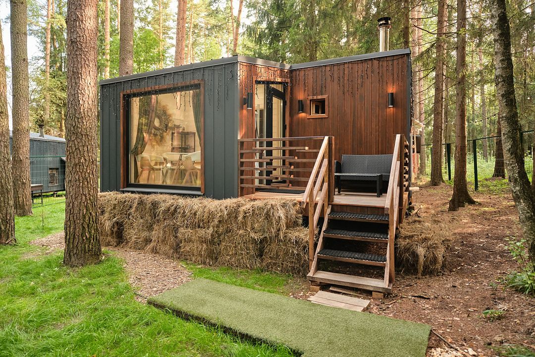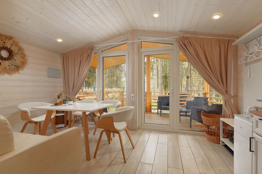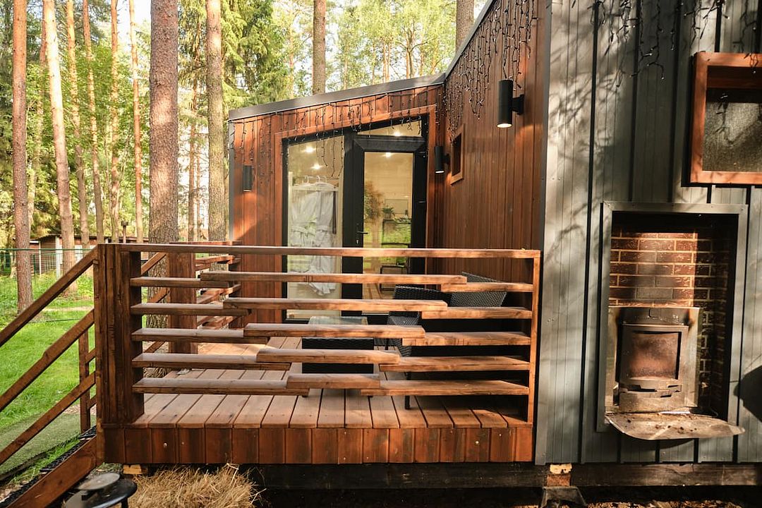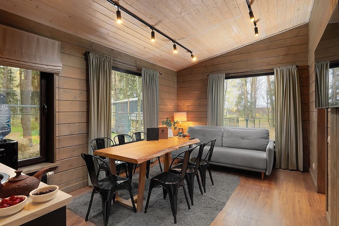 На нижнем уровне находятся прихожая, просторная гостиная, включающая обеденную зону, 2 дивана и настоящий электрический камин, ванная комната с ванной. Есть выход на большой балкон с прекрасным видом на лес. На верхнем уровне (подъем по лестнице) уютная спальня с двуспальной кроватью и панорамным окном, вид на лес.Услуги и удобства