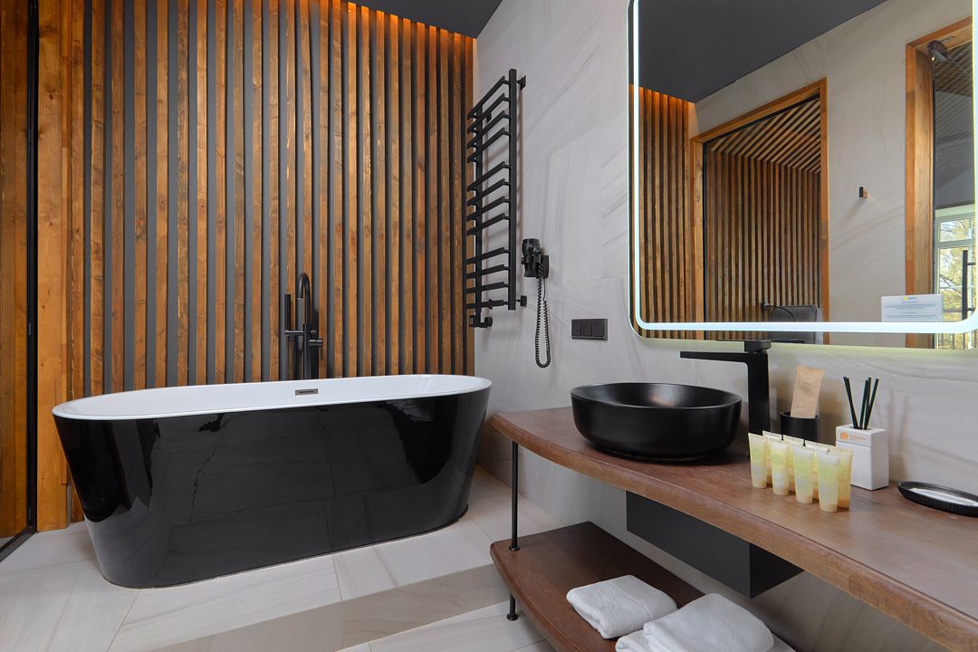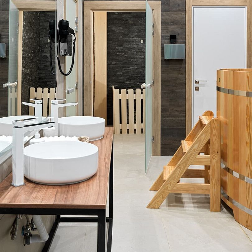 Spa-зона включает две парные: классическую финскую сауну и ароматную травяную парную. Здесь также предусмотрена стильная зона для отдыха, где гости могут расслабиться после процедур и насладиться чаепитием с близкими. Для охлаждения после горячих бань предусмотрены купели, а смельчаки смогут испытать контрастные водные процедуры с помощью обливных ведер.