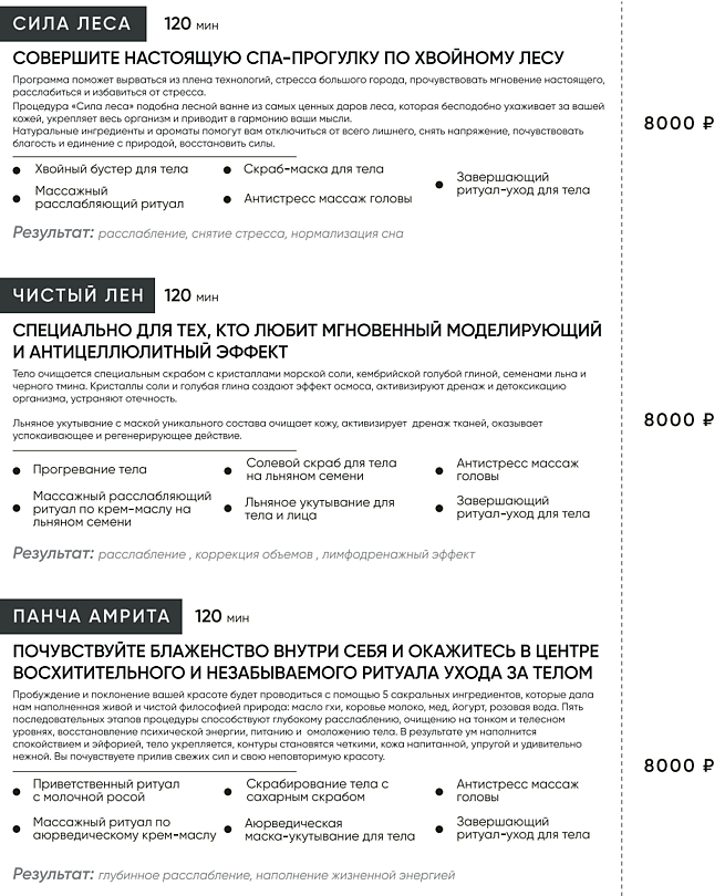 Программа «Сила леса» объединяет массаж и хвойный бустер, создавая атмосферу лесного уединения. «Чистый лен» моделирует фигуру и борется с целлюлитом, используя полезные свойства льна. Аюрведический ритуал «Панча Амрита» открывает двери в мир восточных практик, погружая в состояние глубокого покоя. «Прана океана» использует морские ингредиенты для эффективного лимфодренажа, словно даря телу второе дыхание.