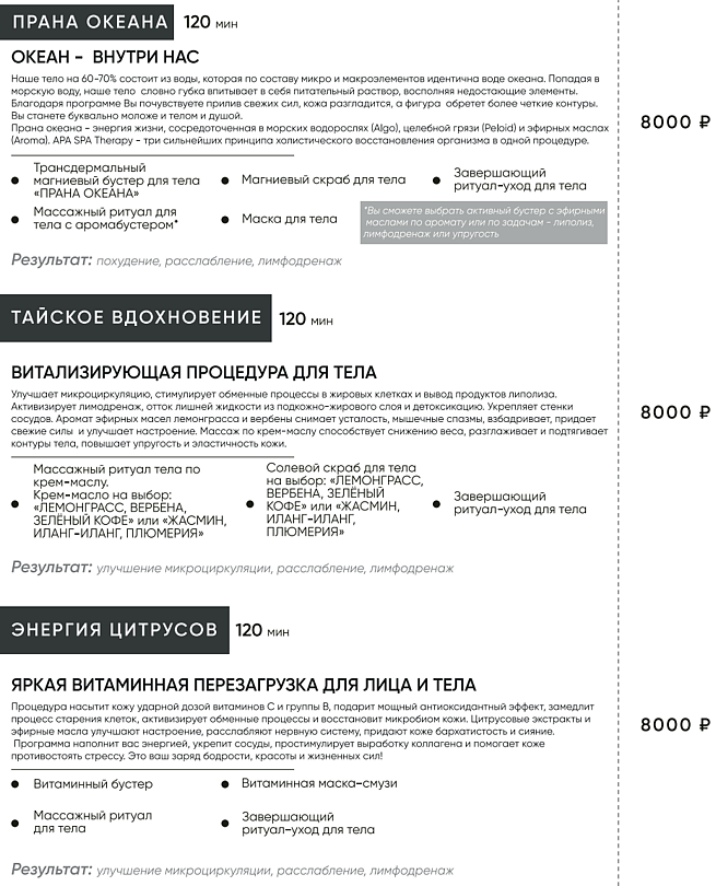 Витальные процедуры «Тайское вдохновение» с жасмином или лемонграссом улучшают микроциркуляцию, а уходы «Энергия цитрусов» и «Классика» возвращают коже тонус и насыщают её витаминами. Каждая программа завершается расслабляющим уходом, дарящим умиротворение и восстановление сил.