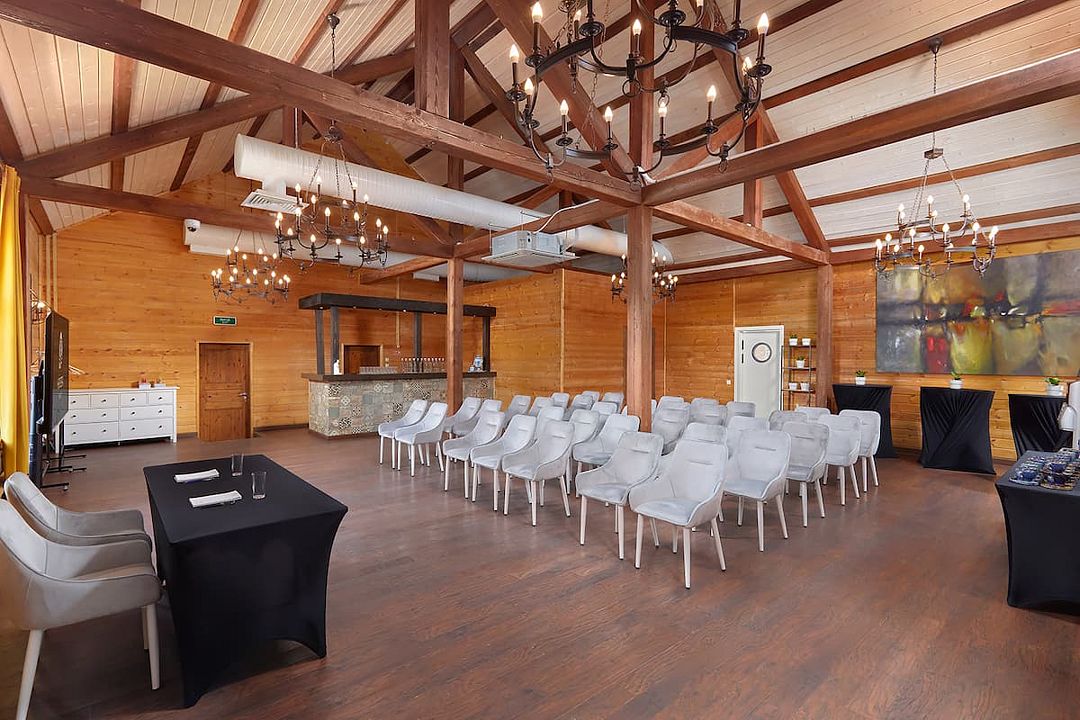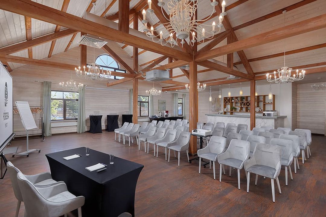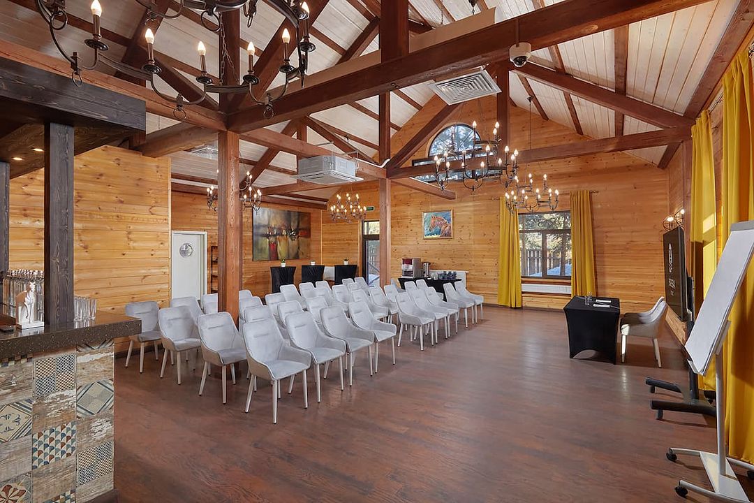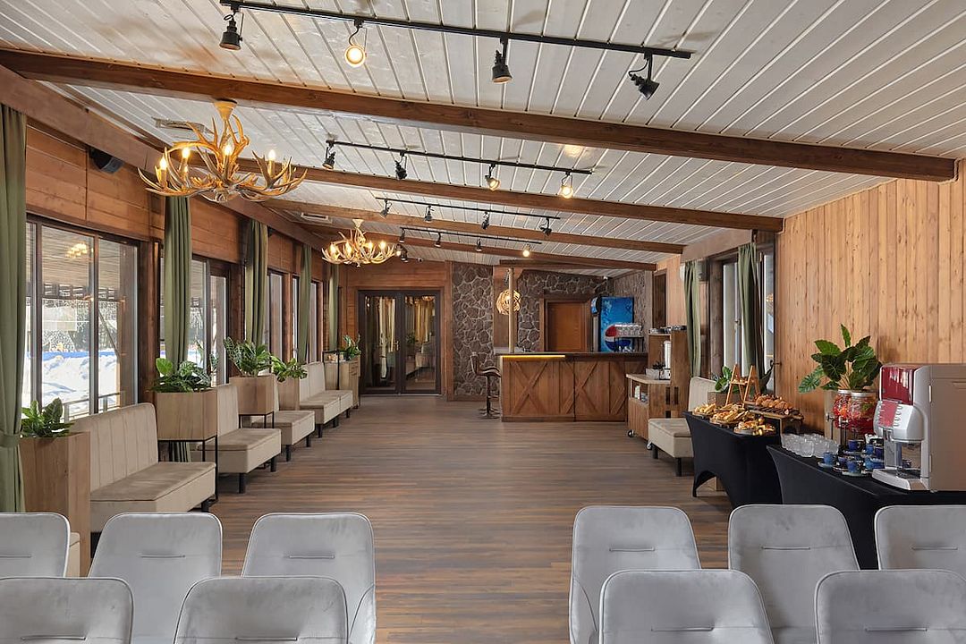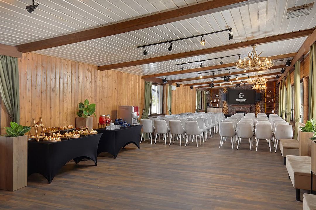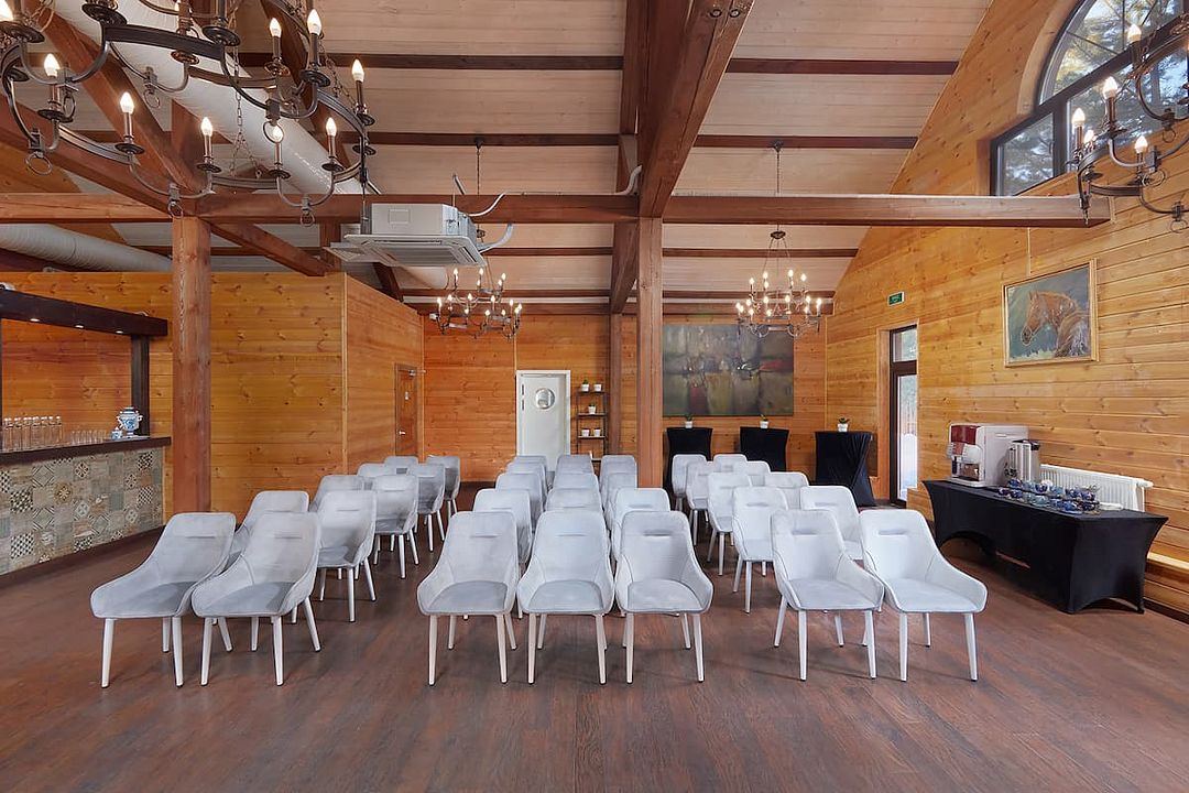 Зал рассчитан на девяносто гостей, что делает его отличным выбором для небольших и средних компаний. В зале есть бесплатный Wi-Fi, а из окон открывается прекрасный вид на лес, что добавляет очарования любому мероприятию.
