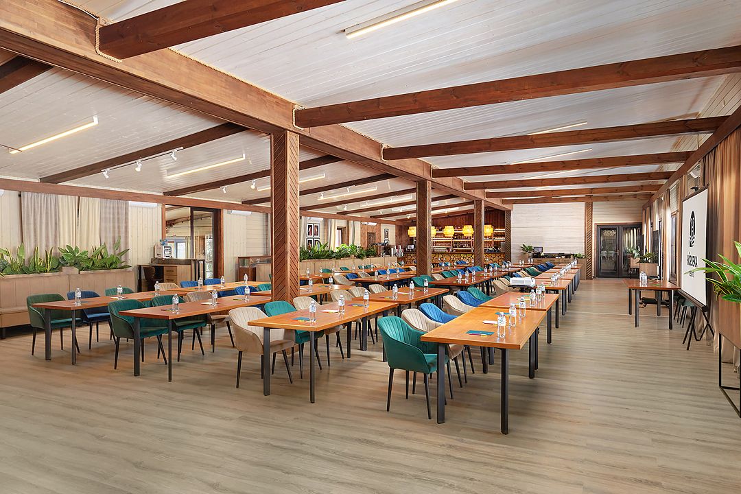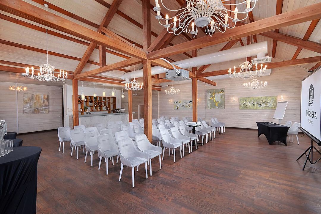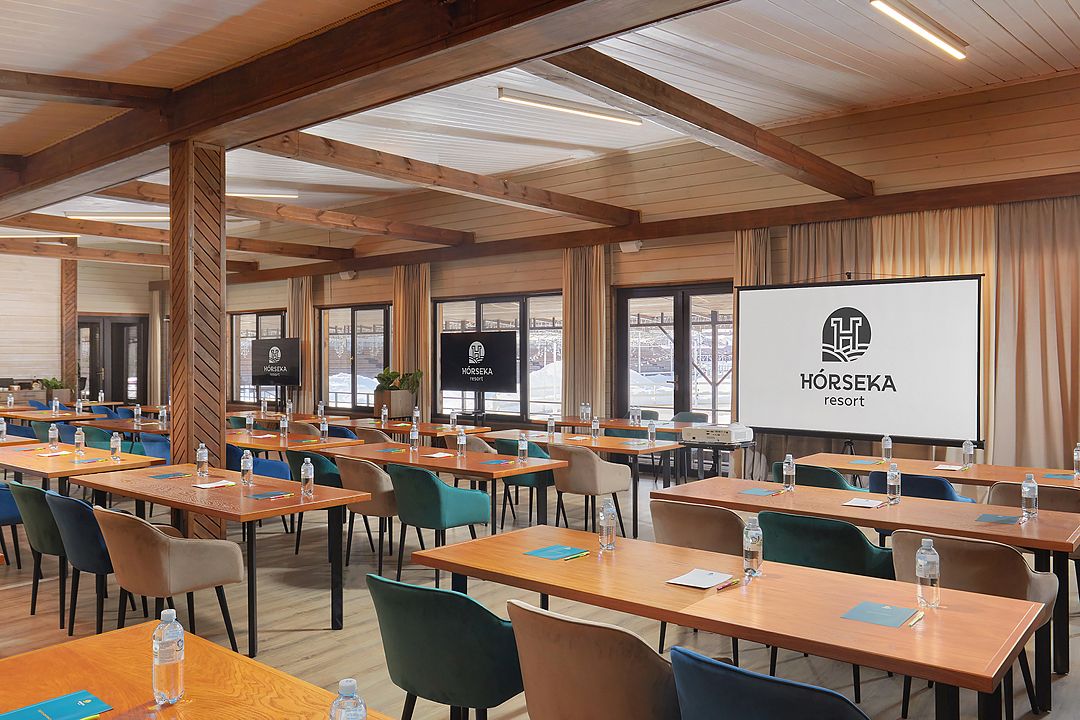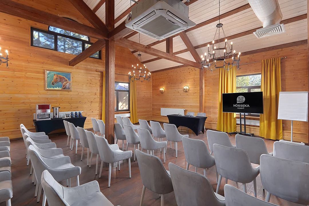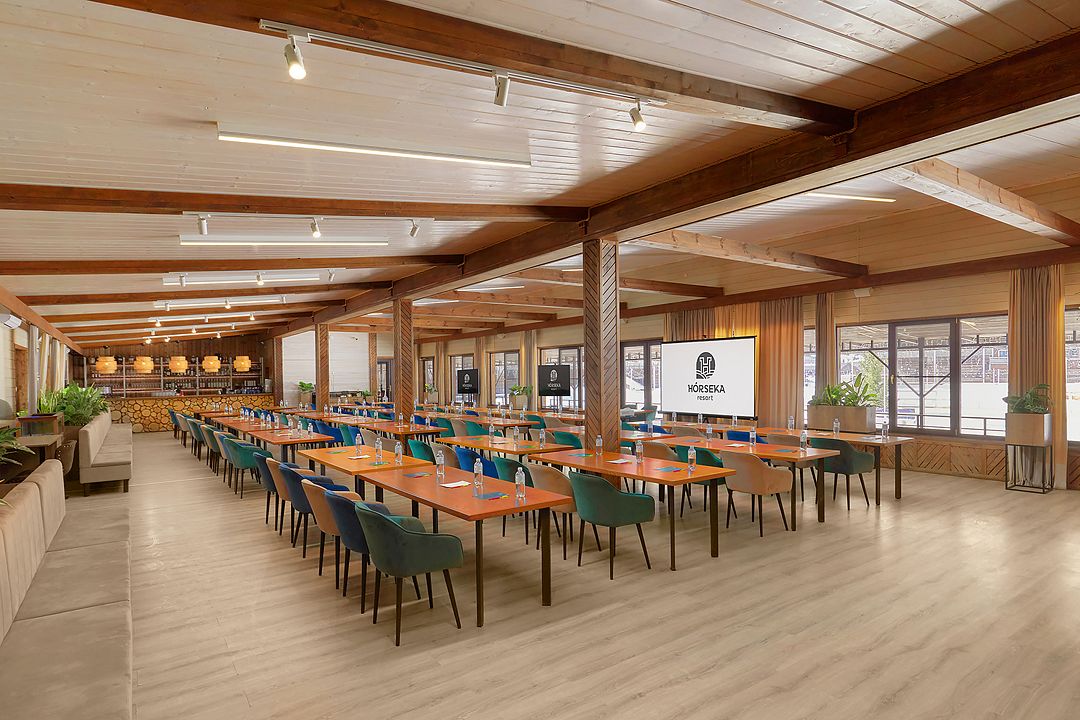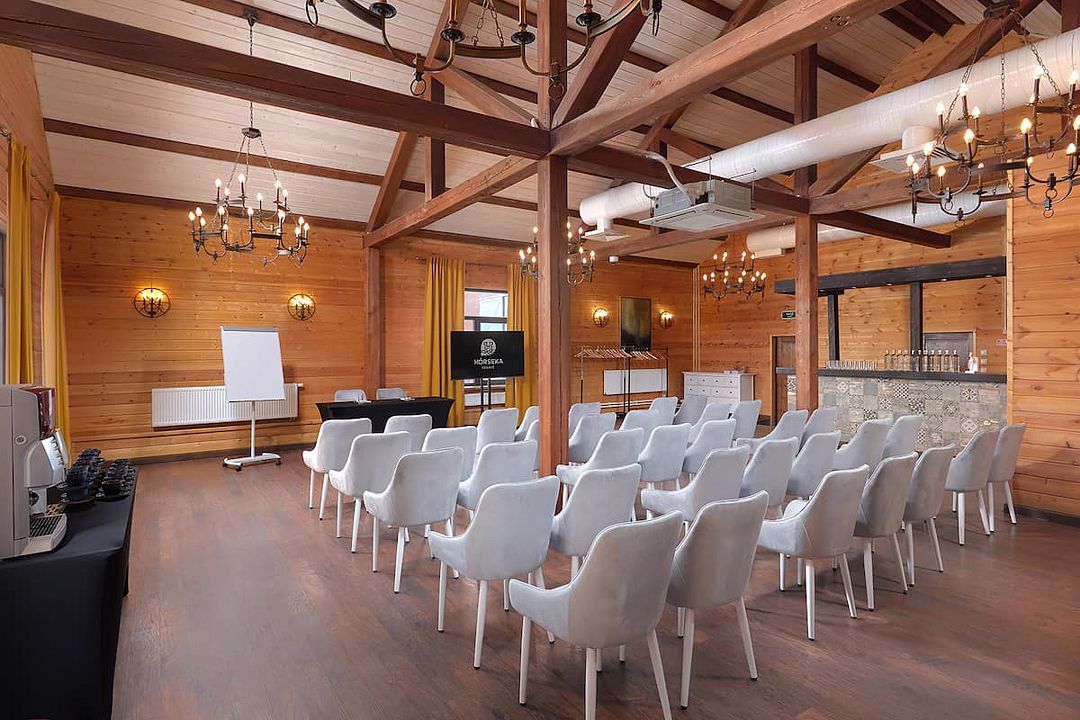 Зал рассчитан на девяносто гостей, что делает его отличным выбором для небольших и средних компаний. В зале есть бесплатный Wi-Fi, а из окон открывается прекрасный вид на лес, что добавляет очарования любому мероприятию.