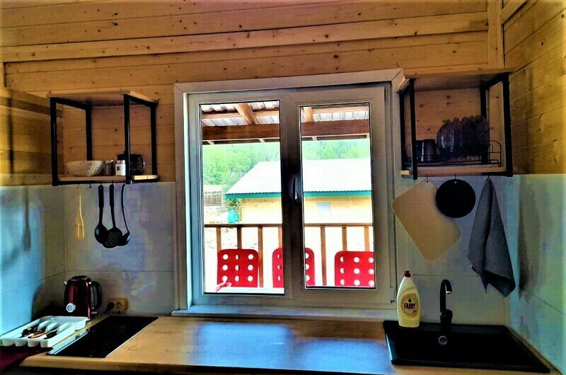 Для большой дружной семьи или компании могут подойти новые 6-местные модульные домики. В домиках 3 комнаты: кухня – гостиная со всей необходимой техникой и посудой, диваном евро-книжкой и телевизором, 2 спальни с двумя односпальными и одной большой кроватью, санузел со всеми удобствами. Есть веранда с видом на горы для приятных посиделок на свежем воздухе.