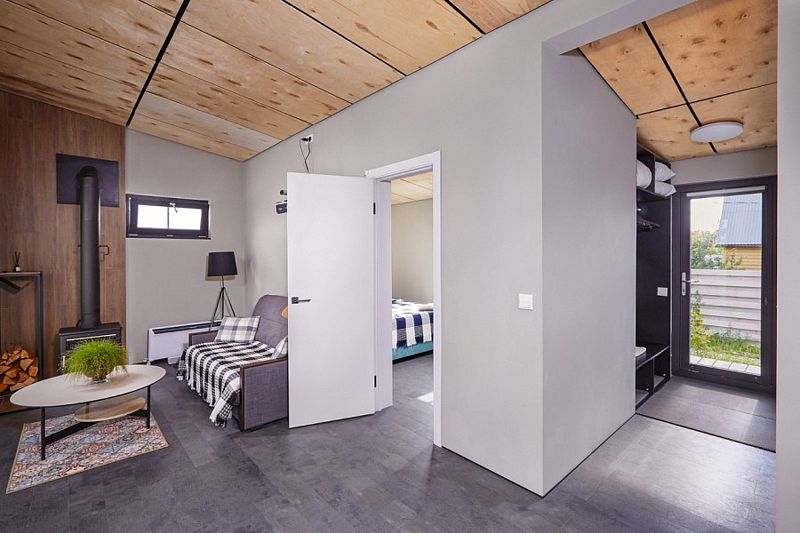 Гостиная с панорамным окном и проектором, кухня, диван-кровать, печь-камин. Одна большая спальня. Санузел с душевой и теплым полом.
