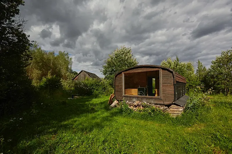 Зона отдыха оборудована всем необходимым: доступ к свежей воде, чайным принадлежностям и столовым приборам создают удобство и уют, гости могут развлечь себя настольными играми или насладиться любимой музыкой с помощью блютус-колонки. Для полного комфорта предусмотрены душевая, раковина и туалет с феном, а также 50-литровый «ливень», подключенный к колодцу, подарит освежающие моменты.