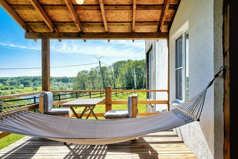 Огромная терраса с уютной мебелью, гамаком и невероятным видом.