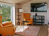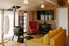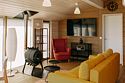 Гостиная зона: с камином и панорамными окнами, большим диваном (трансформируется в спальное место), телевизором и журнальные столики в 3 вариантах, настольные игры.