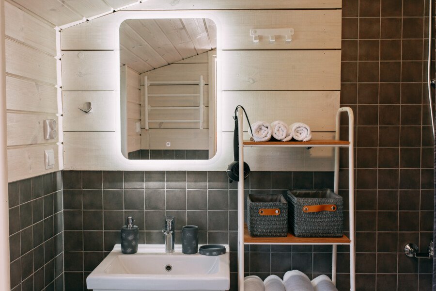 Санузел и ванная: со всем необходимым — салфетки, бумага, гель для душа, шампунь, кондиционер, жидкое мыло.