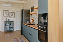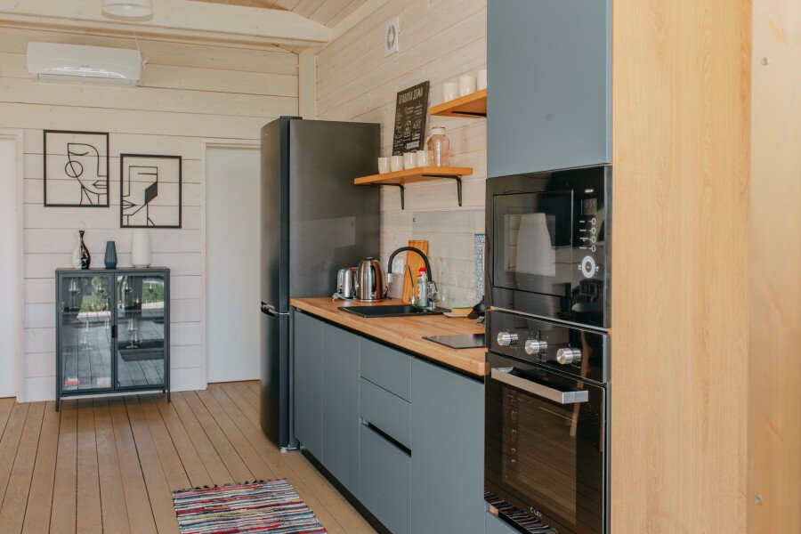 Кухня: кухонный гарнитур, обеденный стол со стульями, холодильник, плита, микроволновая печь, духовка, тостер, чайник, посуда, фильтр для воды, шампура и решетки.