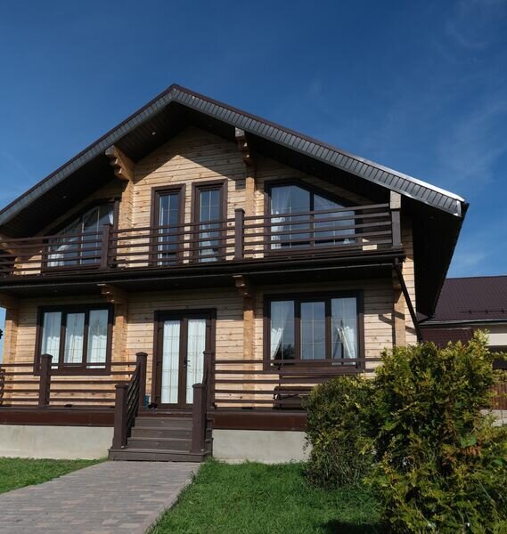 Двухэтажный дом из сруба располагает просторными спальнями с панорамными окнами, двумя санузлами с душевыми, большой удобной столовой и гостинным залом.