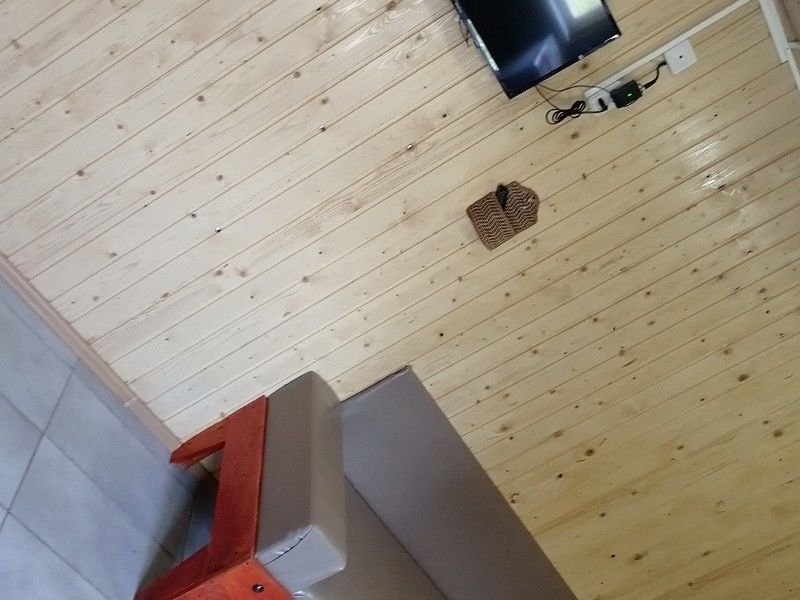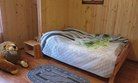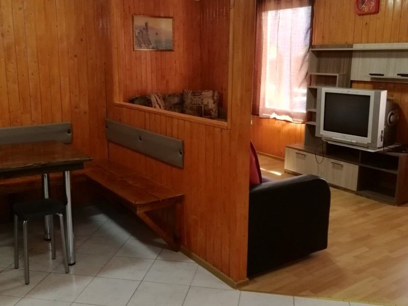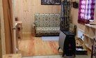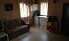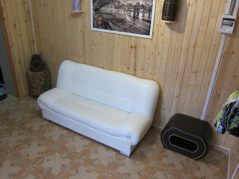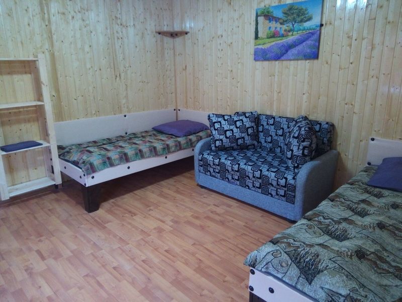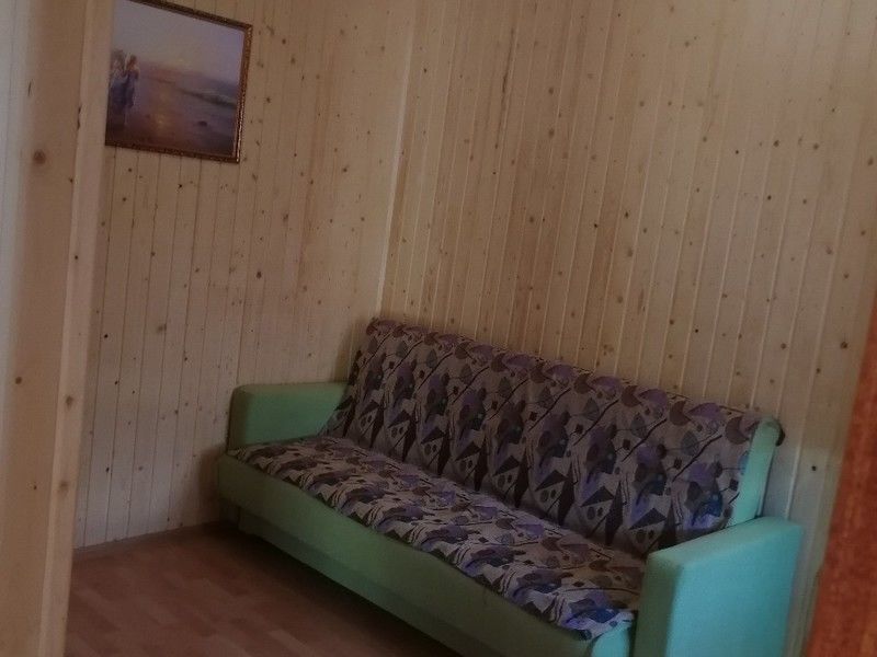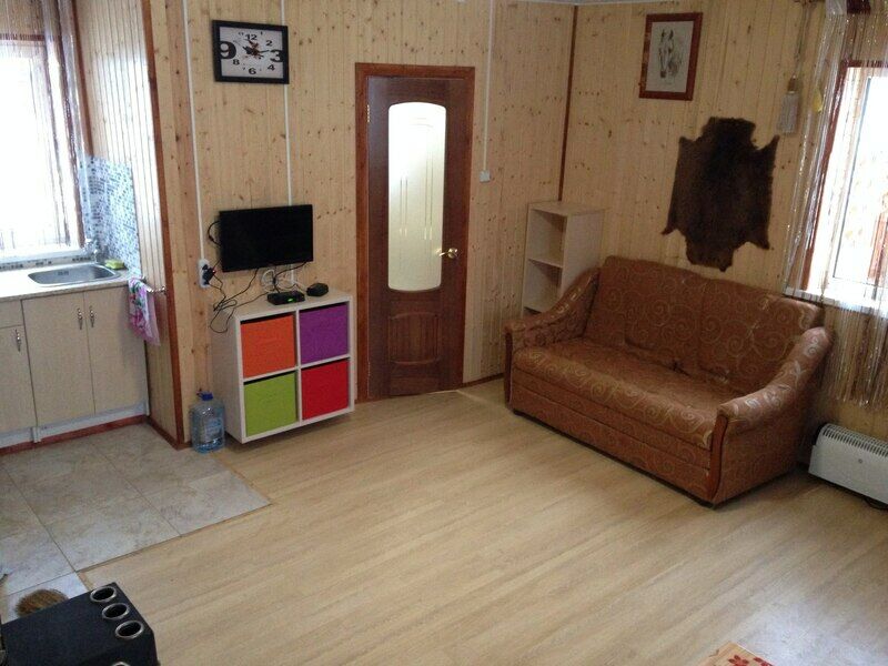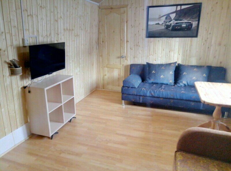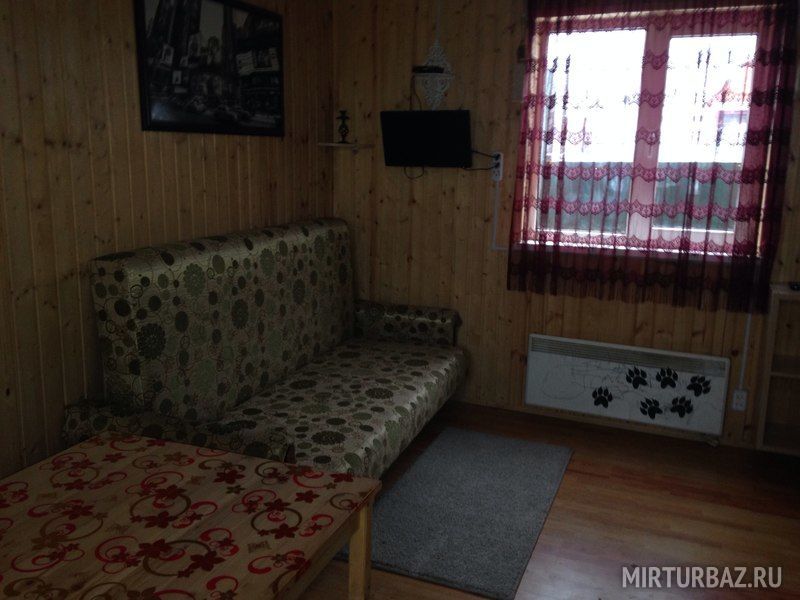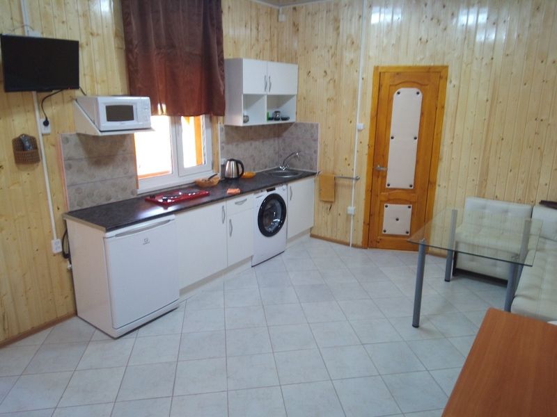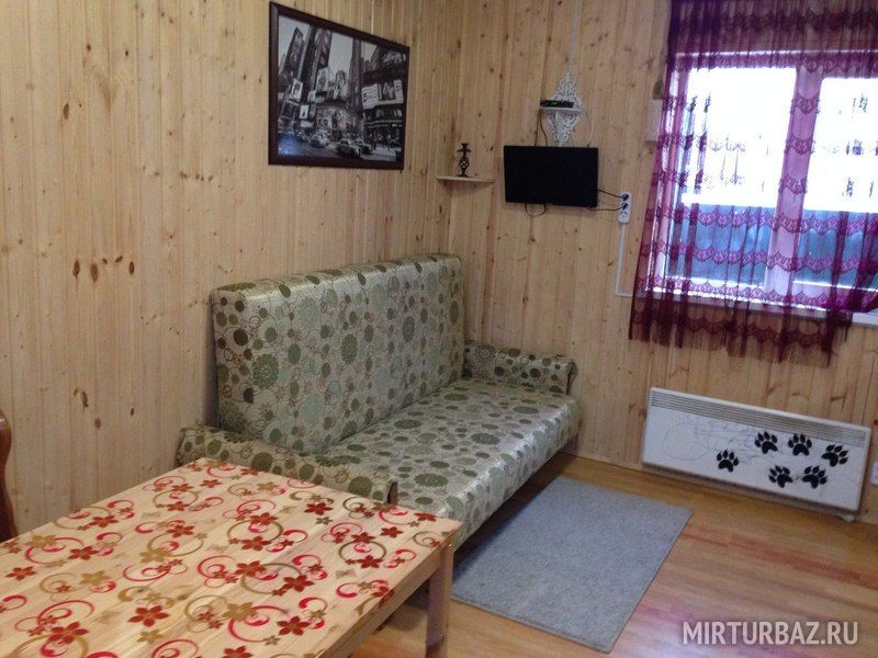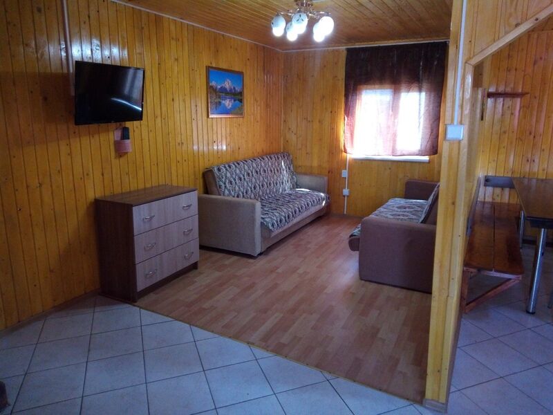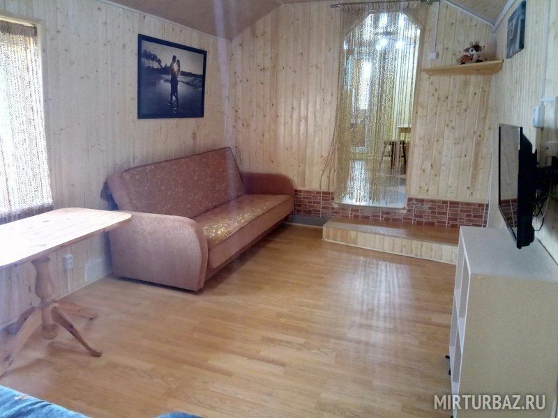 Домик с собственной кухней, обеденным столом, душем и телевизором. В доме есть кровать диван и кушетка.