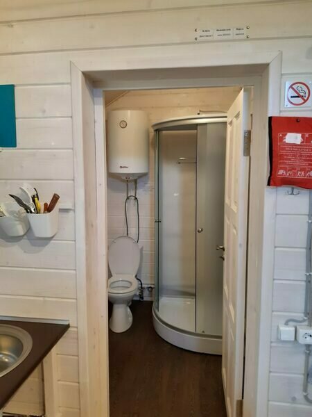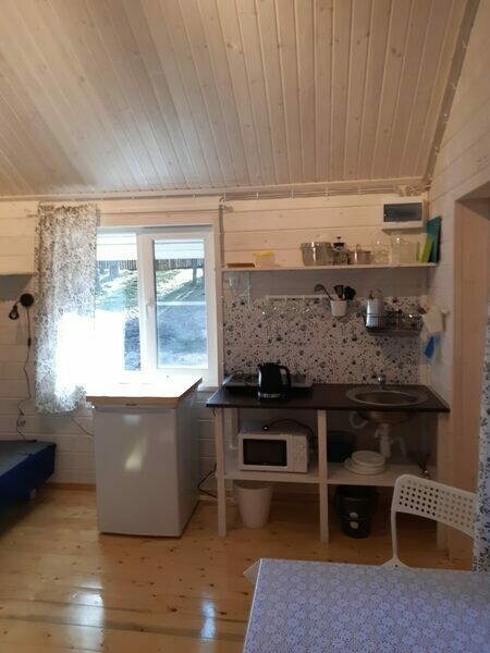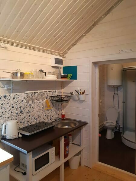 Уютный дом для комфортного отдыха 4 x человек. В доме просторная, светлая гостиная с кухонной зоной и небольшая спальня с кроватью. В доме есть все необходимое для приготовления пищи (микроволновая печь, индукционная плита, электрочайник, посуда на 4х человек и д.р. Дом оборудован своим отдельным санузлом с душевой кабиной. Есть своя крытая терраса и бесплатная парковка около дома.