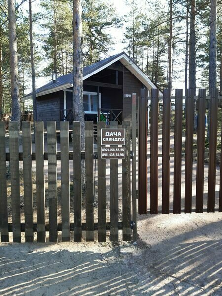 Едете прямо, проезжаете АЗС. Двигайтесь прямо, через 600 метров доезжаете до поворота налево на грунтовую дорогу. Там будет указатель Дач «Сканди» . Поворачиваете налево. Двигайтесь прямо 120 метров до перекрестка, справа стоит дом с красной крышей и красным забором.