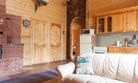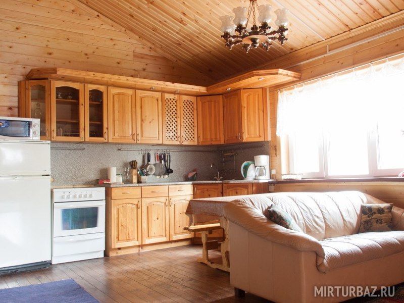Небольшая гостиная совмещенная с кухней, позволит чувствовать уют и тепло деревянного дома.