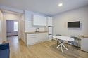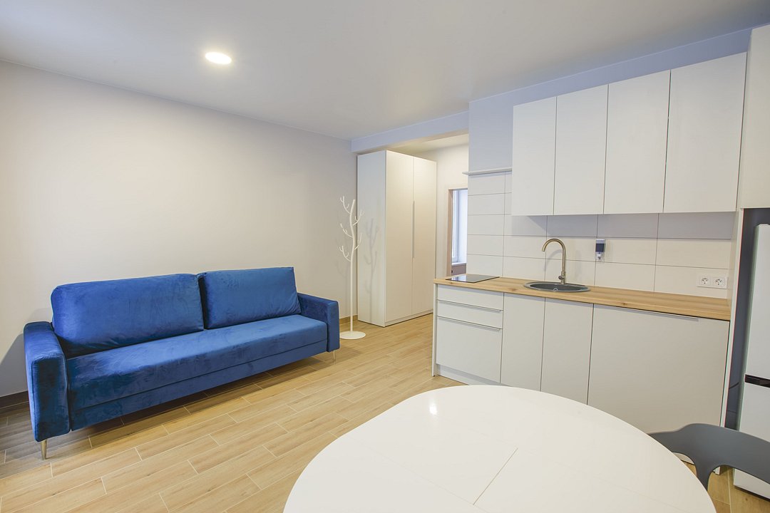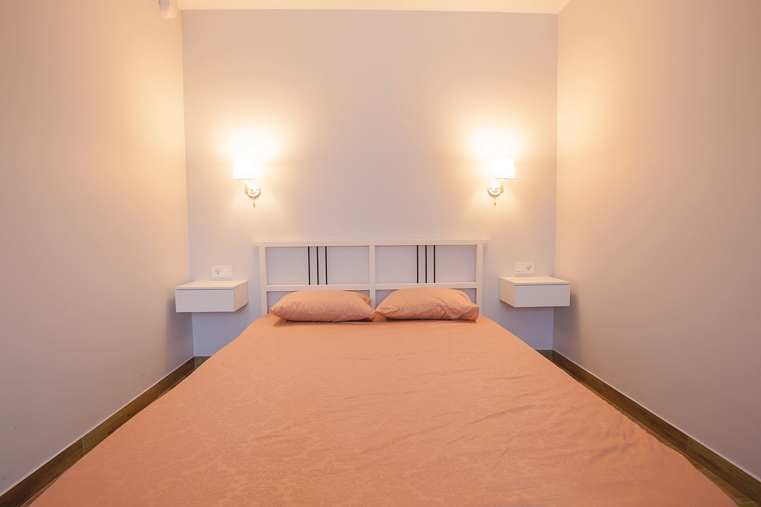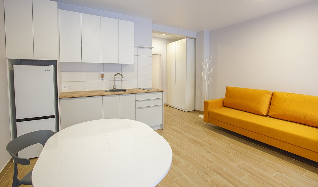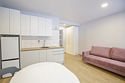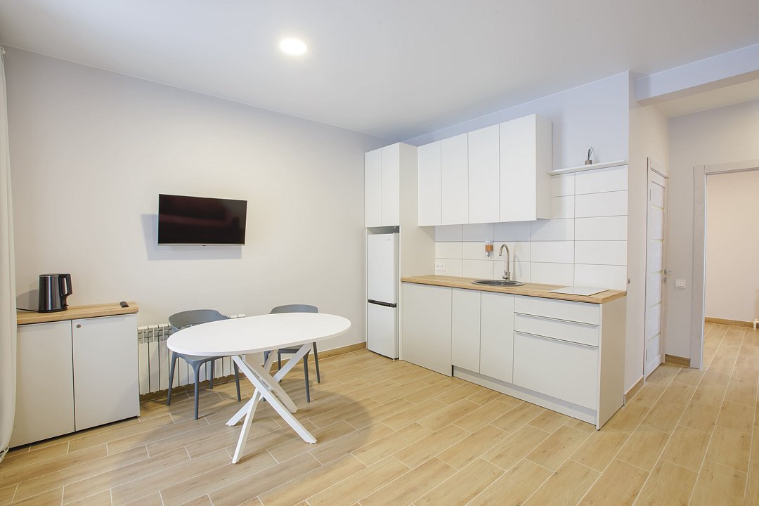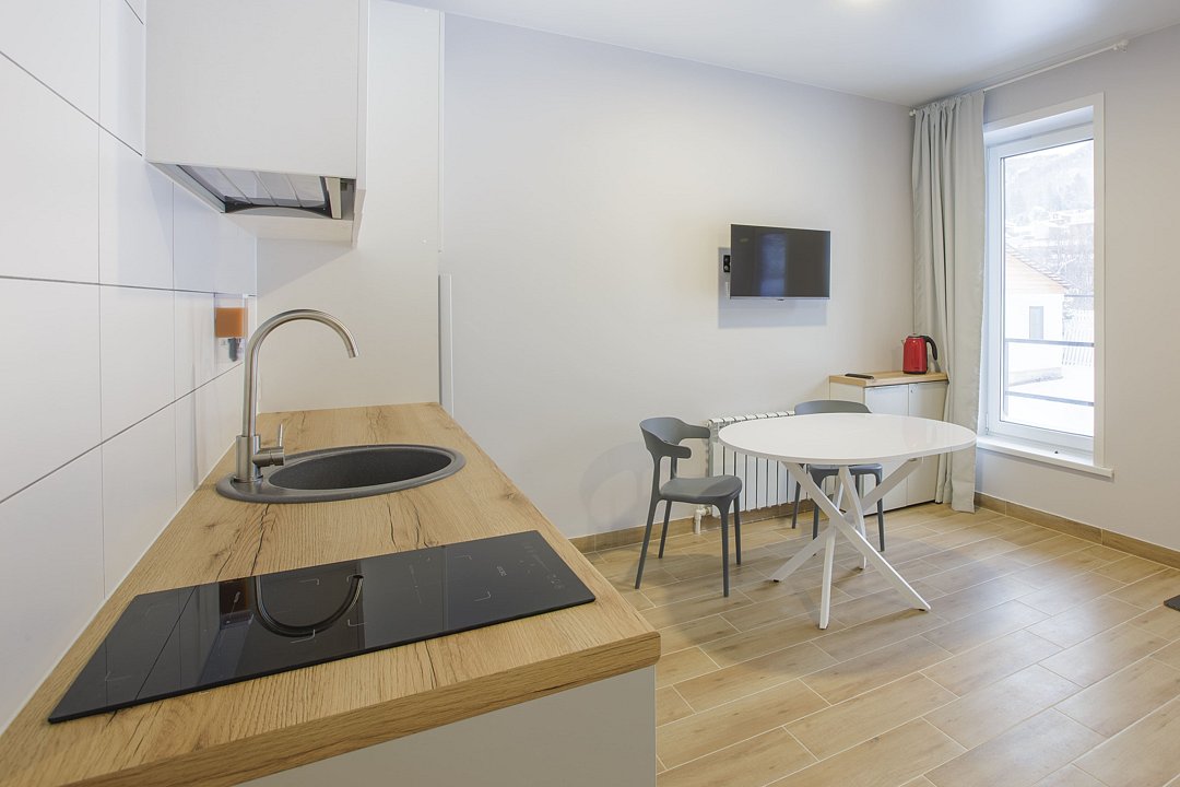 Двухкомнатный номер. Двуспальная кровать, раскладной диван, телевизор, оборудованная кухонная зона, чайник, холодильник, с/у с душевой.