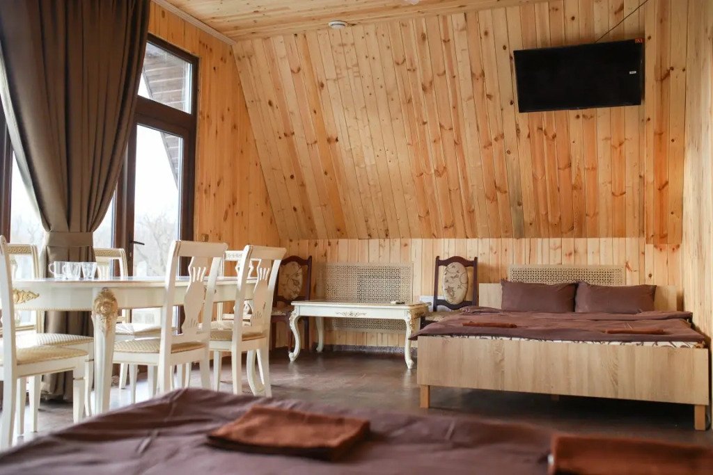 Wi-Fi, кондиционер, микроволновая печь, санузел, терраса, две двуспальные кровати, стулья, обеденный стол, зеркало, чайник, унитаз, отопление, душ, туалетные средства, мангал, панорамные окна, мини-холодильник, вид на горы, телевизор со Smart TV, вид на бассейн, экологичный подход, набор для приготовления чая и кофе, мыло, можно с питомцамиВ номере