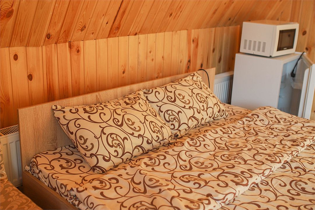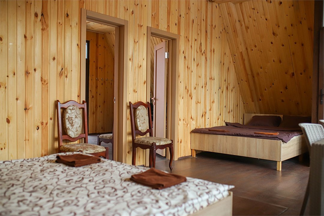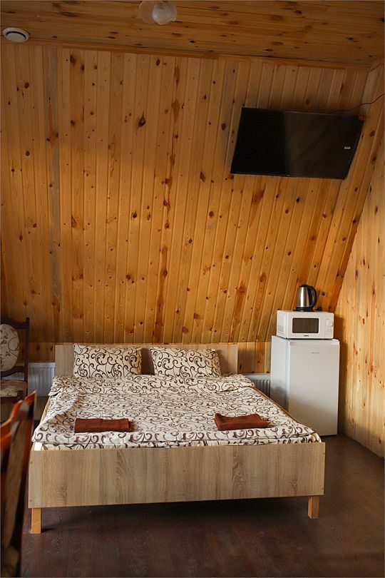 НедостаткиНеухоженная территория возле домиков, отсутствие душа-лейки, т.е. вода только сверху, помыться и не намочить голову - невозможно. Отсутствие в домике вешалки для одежды. Есть только стулья куда можно положить вещи. Шкафа никакого тоже нет. Чайник грели на полу возле кровати, т.к. розетка есть только там. Очень много уличных собак, утро у нас началось часов в 5 утра, т.к. очень громко лаяли собаки, а так хотелось тишины, которая должна быть в лесу и горах.