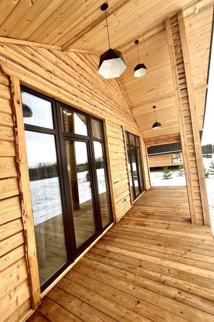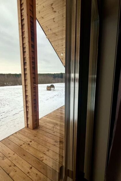 На террасе банного комплекса находится комфортный банный чан, предлагающий потрясающий вид на Сосновый Бор. Здесь гости могут погрузиться в горячую воду и насладиться атмосферой спокойствия и уюта.