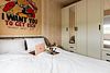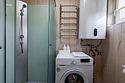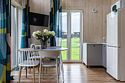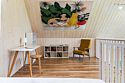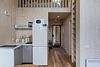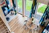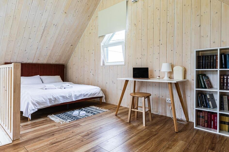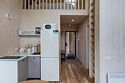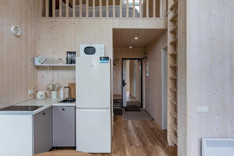Внутреннее пространство включает отдельную спальню, кухню-гостиную с раскладным диваном, зону для сна и отдыха на втором уровне, санузел с душевой кабинкой, удобную мебель, технику, полный набор посуды, свежие полотенца, постельное белье и базовые средства гигиены.