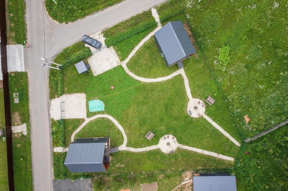 На свежем воздухе также предусмотрены все условия для приятного времяпровождения: терраса с возможностью завтрака на улице, место для мангала и кострища, где можно поужинать на свежем воздухе и любоваться звездами. Для дополнительного удобства предусмотрена парковка, а безопасность гостей обеспечивается видеонаблюдением на входной группе.